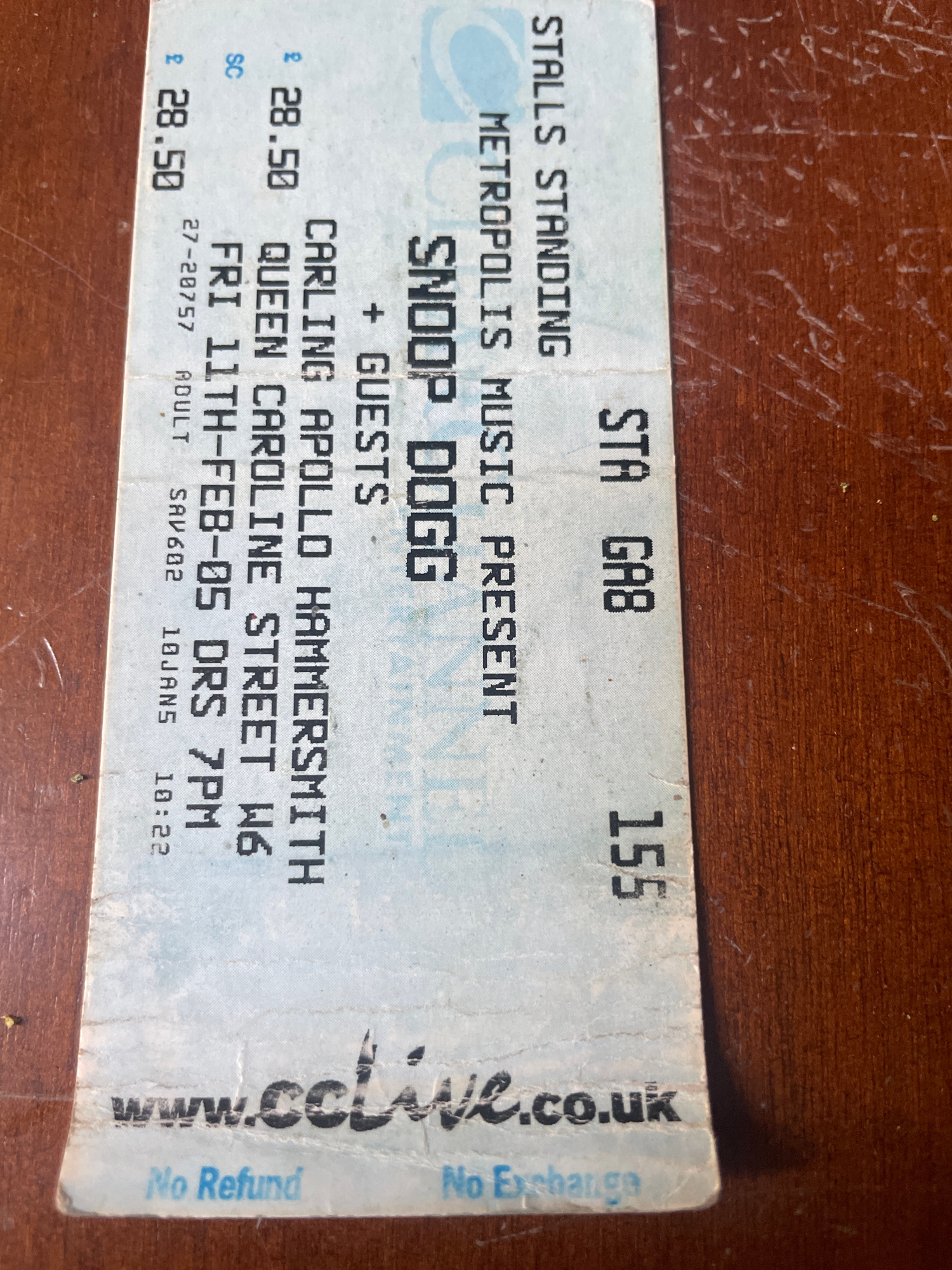 The image shows a ticket stub for a Snoop Dogg concert presented by Metropolis Music. The concert was held at the Carling Apollo Hammersmith, located on Queen Caroline Street W6. The concert took plac…read more