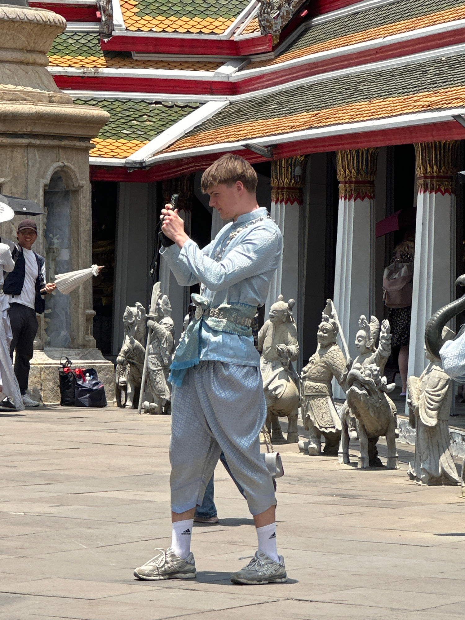 The image shows a man standing on a paved surface next to a temple in Bangkok, Thailand. He is dressed in a traditional light blue Thai outfit and is holding a dark object in his hands, possibly a pho…read more