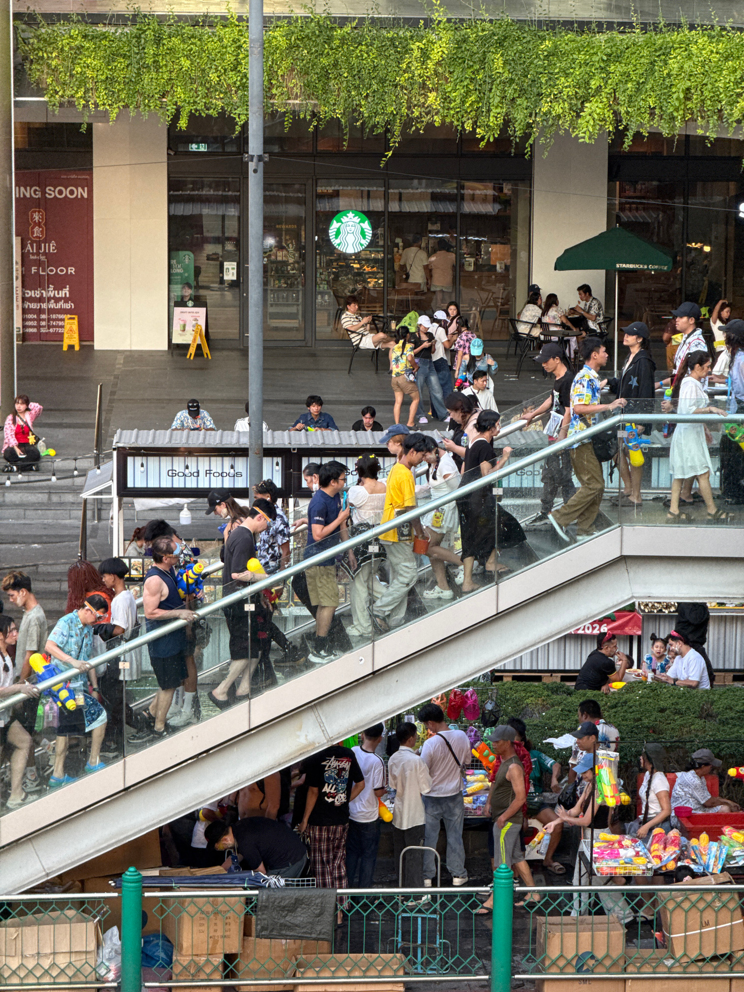The image depicts a street scene in Bangkok, Thailand, likely during a Songkran water festival. A large crowd of people, many armed with water guns, are visible on both sides of an elevated walkway. T…read more