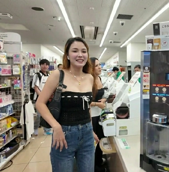 The scene is set inside a 7-Eleven convenience store, located in Shinjuku, Japan. The environment features overhead fluorescent strip lighting, visible security cameras, and white shelving units stock…read more