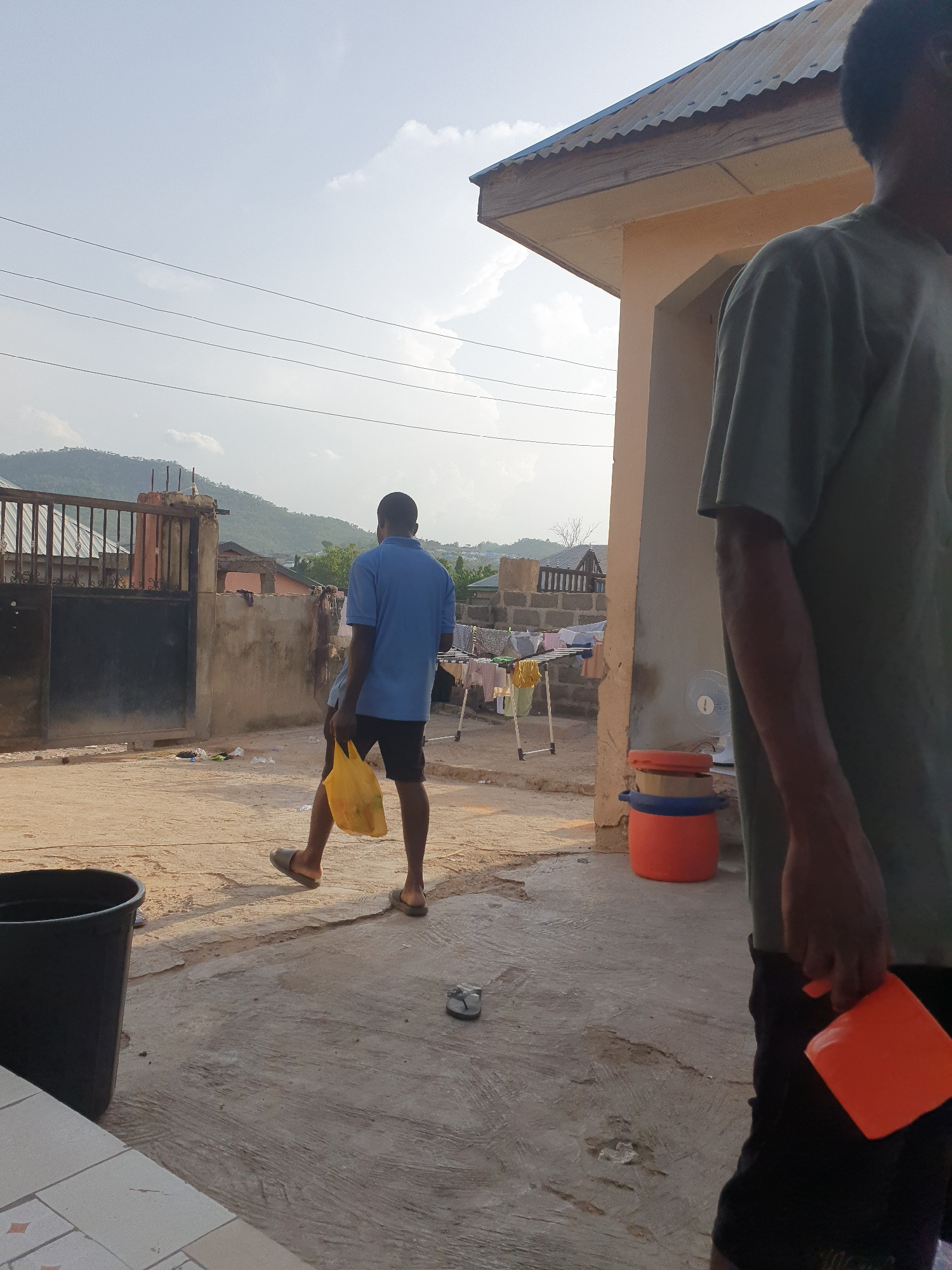 The image captures an outdoor scene in Lokoja, Nigeria. A man in a blue shirt and dark shorts is walking away from the camera. He is carrying a yellow object, possibly a bag or container. The ground a…read more