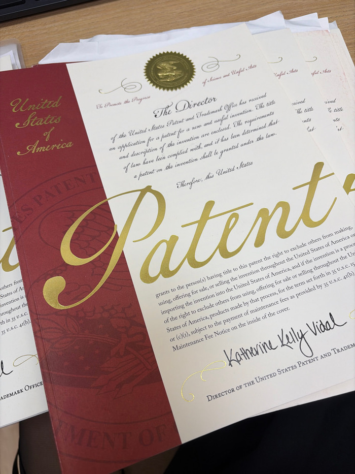 The image displays a stack of official United States Patent documents resting on a light brown wooden surface, likely a desk, in Ramat Gan, Israel. The uppermost document is predominantly featured, exhibiting a maroon-red vertical band on its left side with "United States of America" in gold script. The primary field is cream-colored, displaying the word "Patent" in large, ornate gold script. A circular gold seal with an eagle emblem is visible at the top-center. Printed text describes the patent grant process, including a signature identified as "Katherine Kelly Vidal, Director of the United States Patent and Trademark." Subtle watermark patterns, resembling an eagle, are discernible within the document's design. Multiple identical or similar documents are stacked beneath the primary one. A dark, indistinct object is partially visible in the upper-left background, with other white papers behind the patent stack. A dark, out-of-focus area at the bottom of the frame suggests a supporting surface or clothing, but no identifiable human features are present. | Open Wire