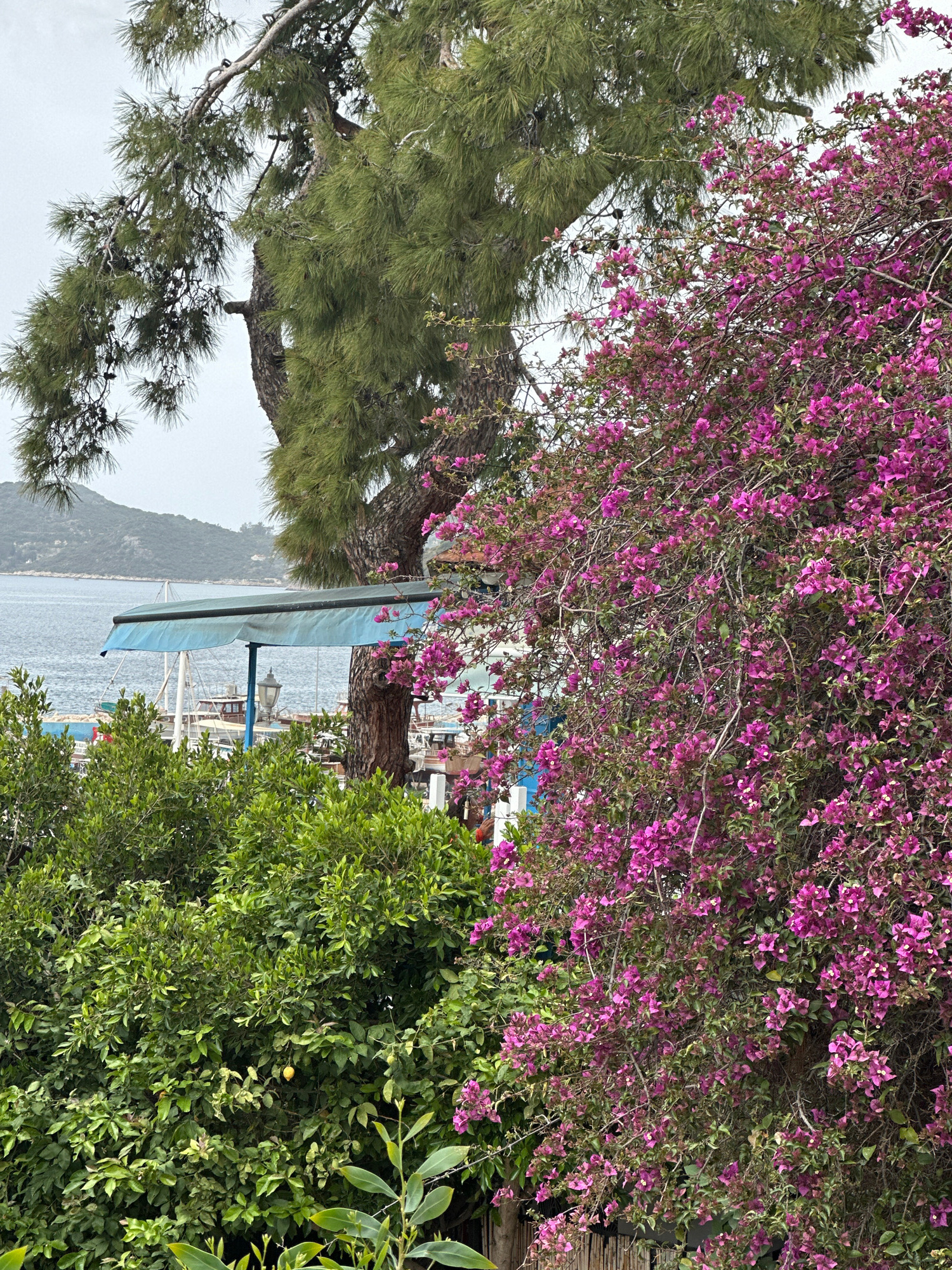 This media file captures a serene coastal landscape in Kaş, Turkey, during daytime under an overcast sky. The image is oriented vertically and features a vibrant array of Mediterranean flora framing a…read more