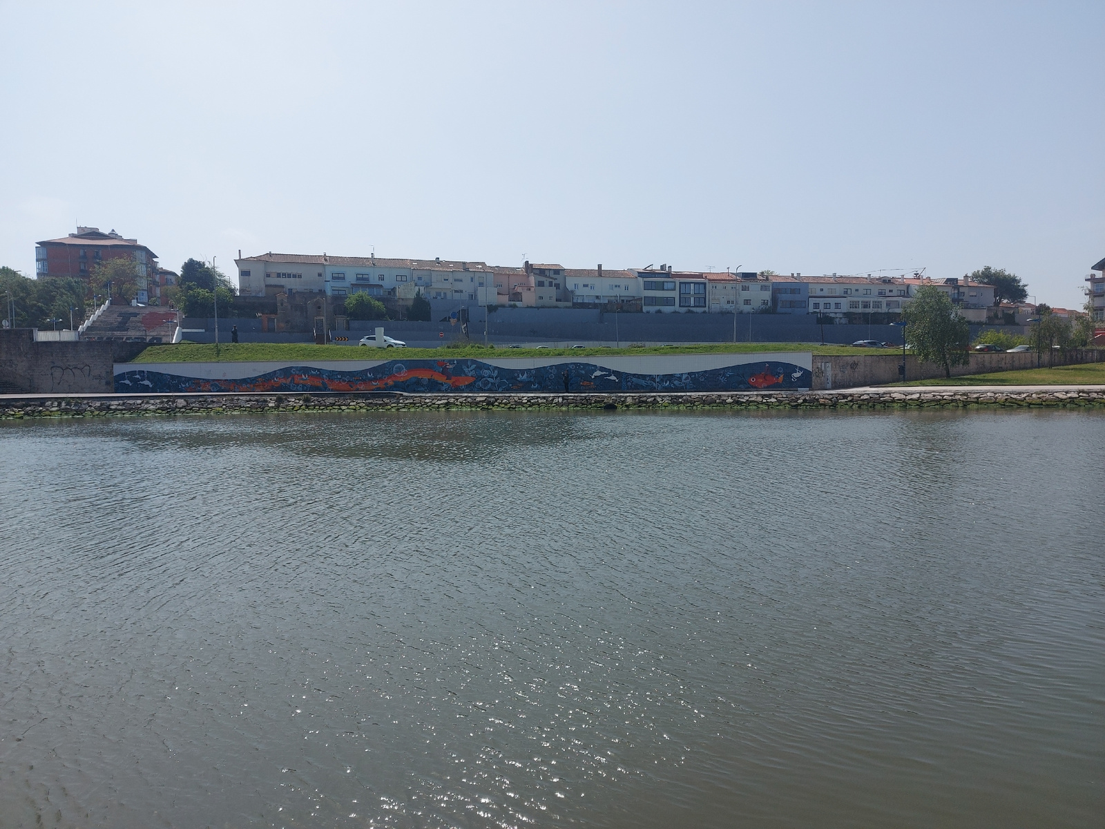 This is an outdoor shot of a body of water in Aveiro, Portugal, featuring a mural on a retaining wall. The water occupies the foreground, with light ripples reflecting sunlight. The mural stretches ho…read more