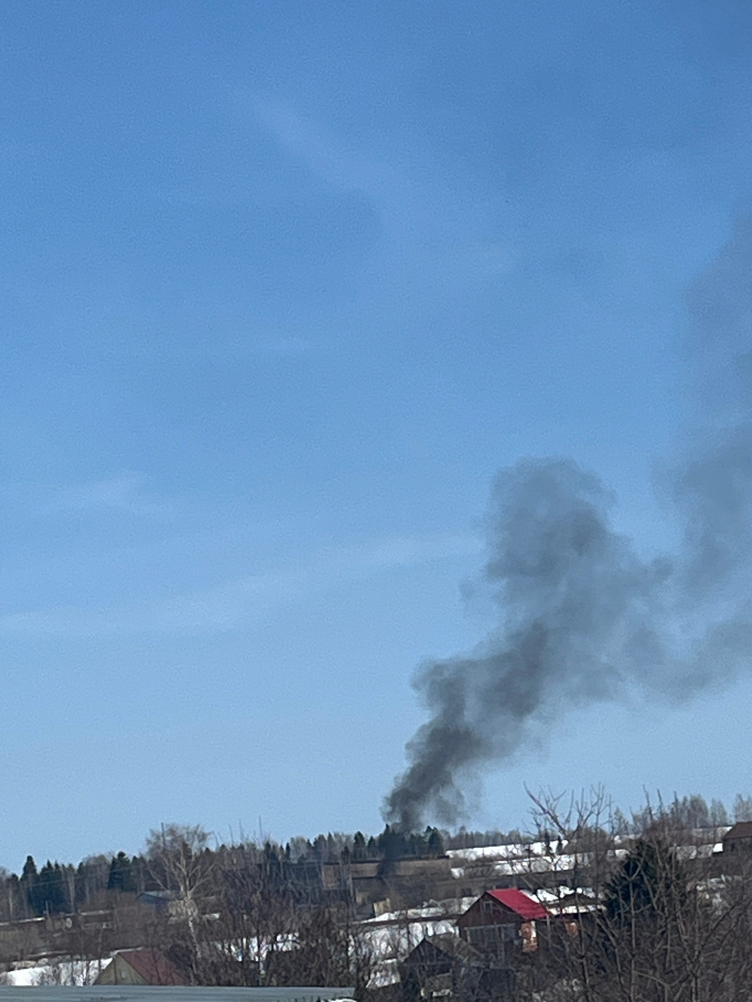 The image shows a plume of black smoke rising into the sky near Pavlovka, Russia. The buildings are visible on the right side of the image, suggesting a dense urban environment. There are trees around…read more