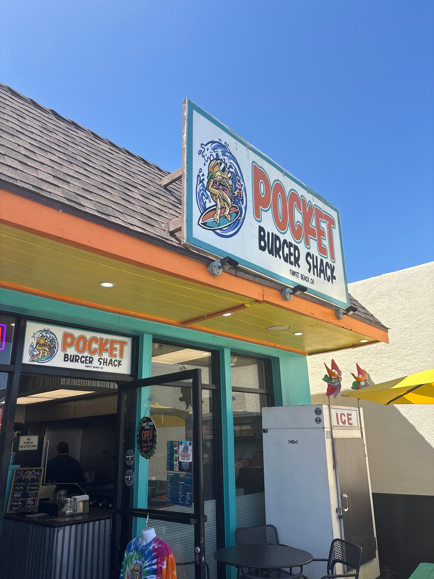 The image shows the "Pocket Burger Shack" restaurant in Sunset Beach, Huntington Beach, California. The restaurant has a large sign with the name on it, plus another sign on the building window. It al…read more