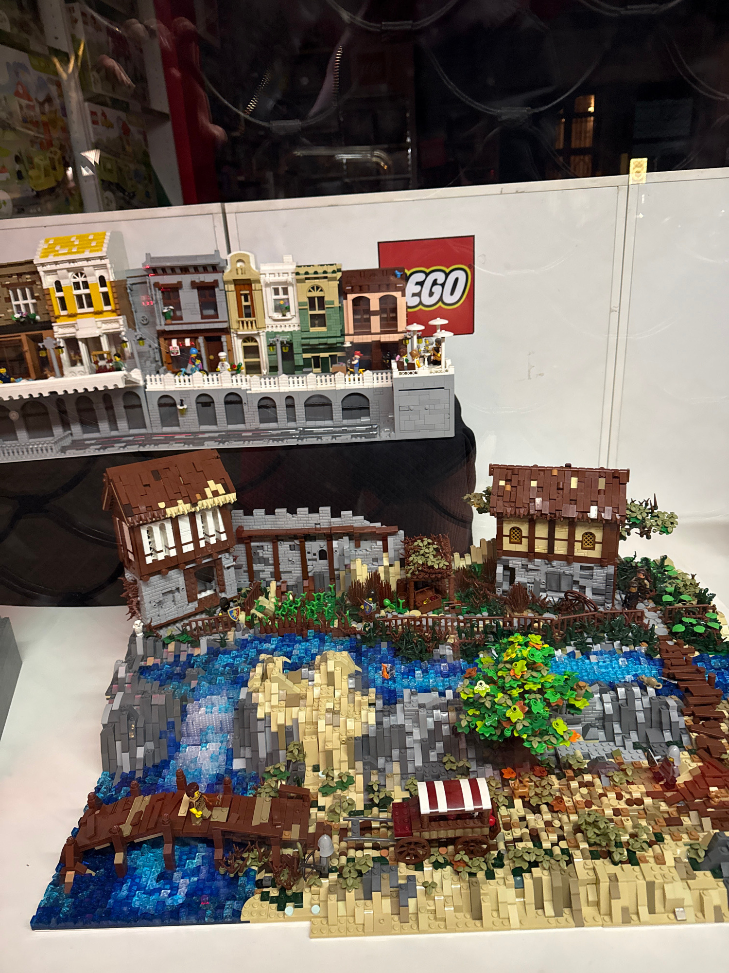 A photograph captures a complex Lego display, likely exhibited within a store or museum. The display consists of three main sections: a row of modular buildings, a grey arched structure, and a naturalβ¦read more