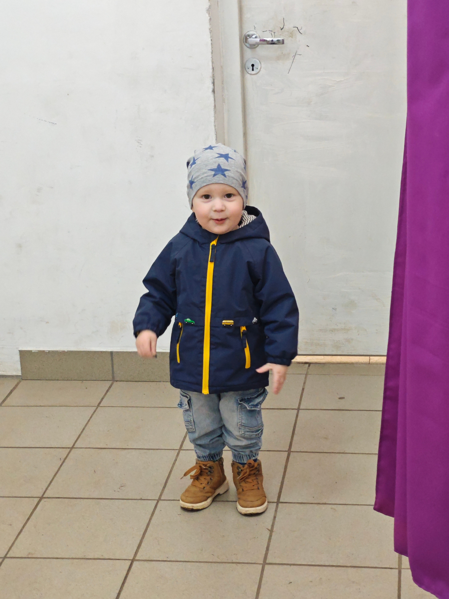 A young child stands on a tiled floor indoors in Марковский, Russia. The child wears a grey hat with blue stars, a navy blue jacket with yellow trim, light blue jeans, and brown boots. Behind the chil…read more