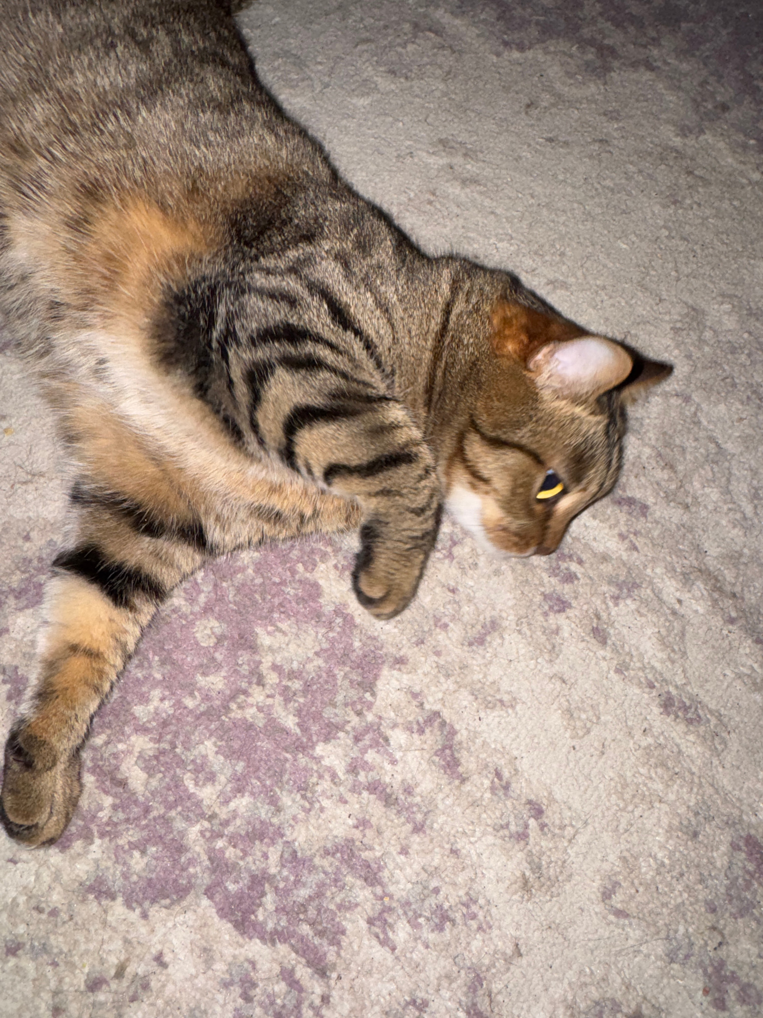 A tabby cat is lying on a textured surface, possibly carpet or fabric, in an indoor setting. The cat is positioned at an angle, with its head and front legs extending towards the upper right corner ofโฆread more