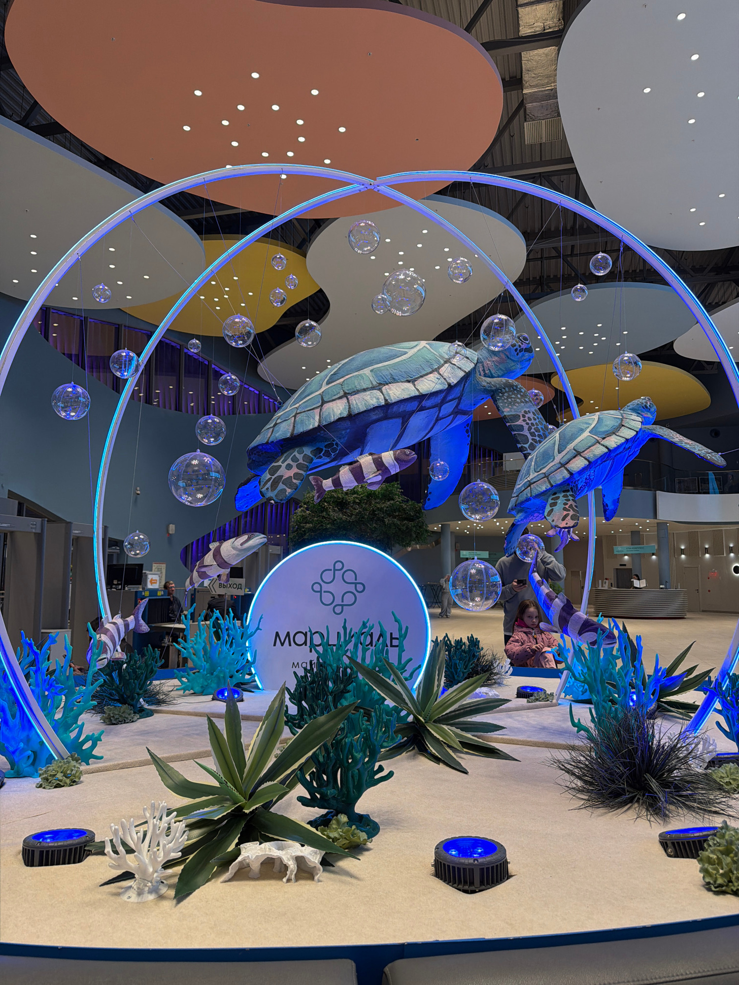 This image shows a decorated indoor space, possibly a shopping mall, featuring a marine-themed installation. Two large, blue turtle figures hang suspended within two circular light-emitting diode ligh…read more