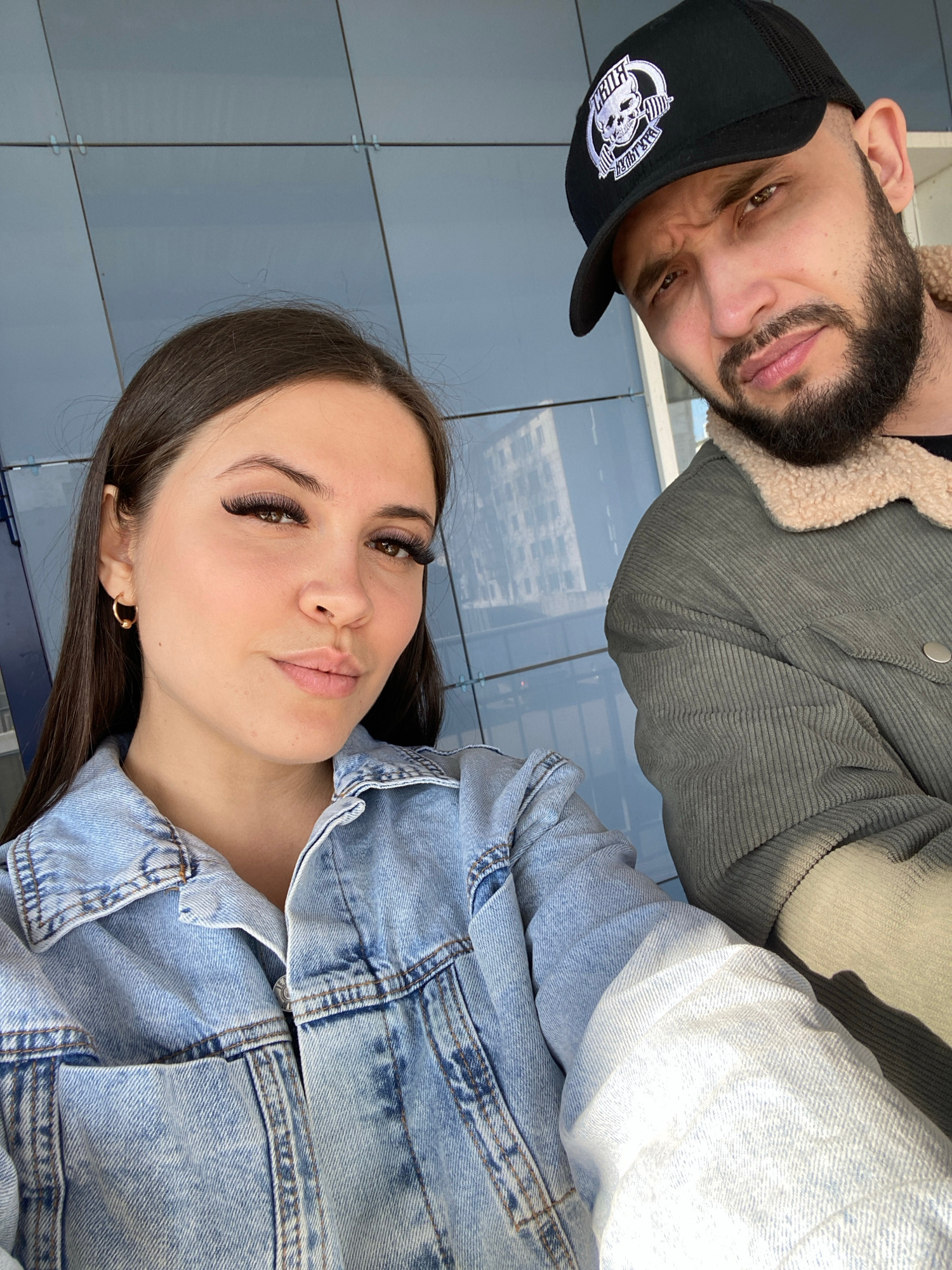 This media file captures a close-up, rotated selfie featuring two individuals, a man and a woman, in what appears to be an urban outdoor setting in Chaikovsky, Russia. The image is rotated clockwise,β¦read more