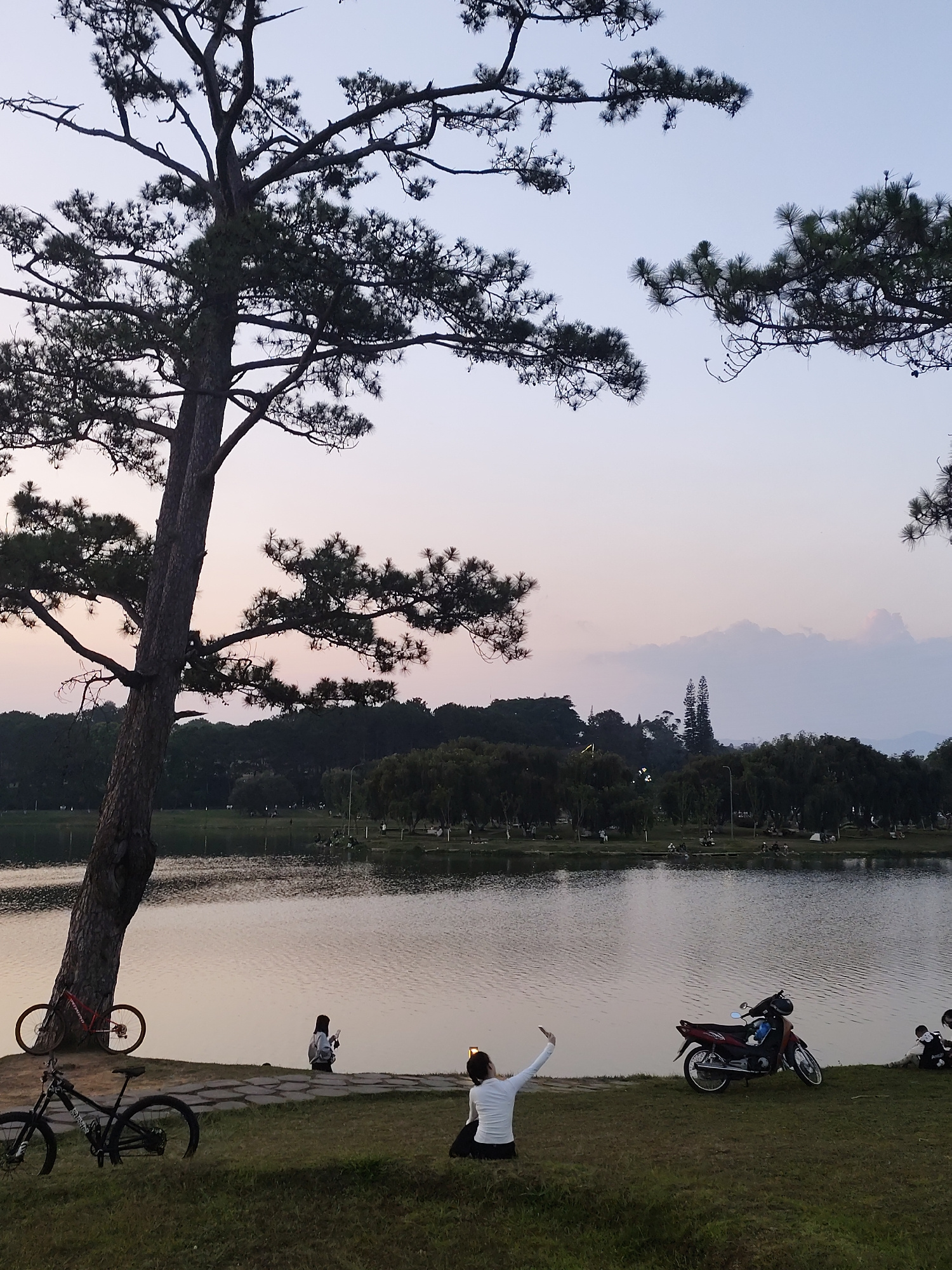 Captured during the daytime in Da Lat, Vietnam, the photo portrays a tranquil lakeside scene. A large tree dominates the left side of the frame, with its branches extending across the upper portion of…read more