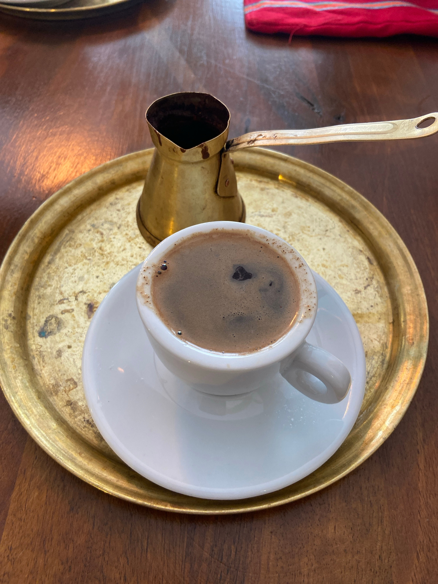A top-down shot presents a scene on a wooden surface, likely a table. A small, white espresso cup filled with dark coffee rests on a white saucer. The saucer is positioned on a tarnished, golden metalβ¦read more