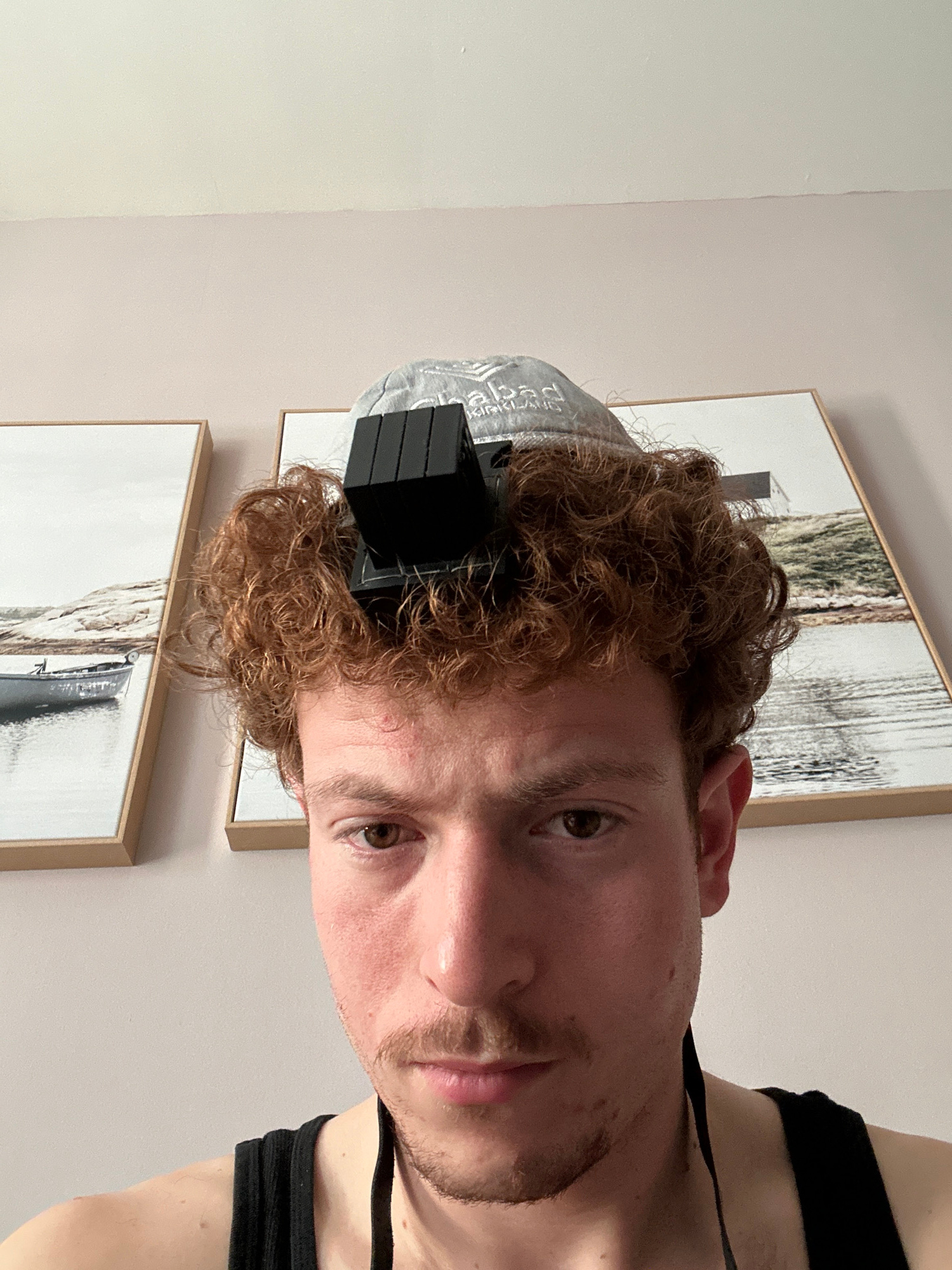 The image presents a close-up, frontal portrait of a young adult male, located in New York City, United States of America. The subject has reddish-brown curly hair, fair skin, brown eyes, a mustache,…read more