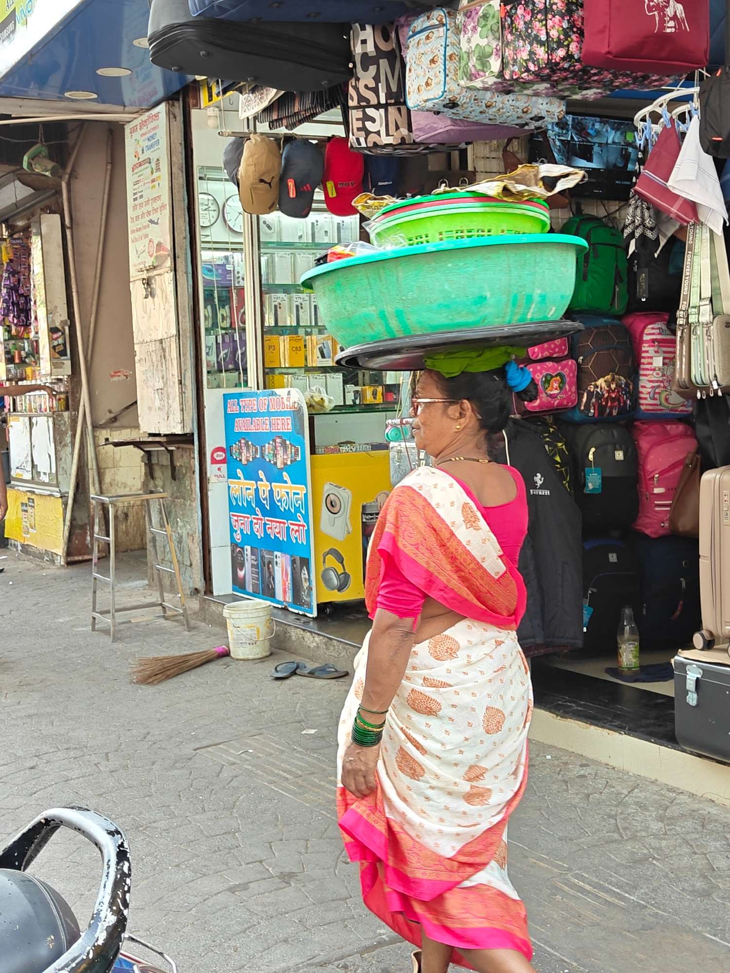 The image captures a street scene in Mumbai, India. A woman wearing a traditional sari, colored white with a pink border and a pink blouse, is carrying a stack of green plastic tubs on her head. The w…read more