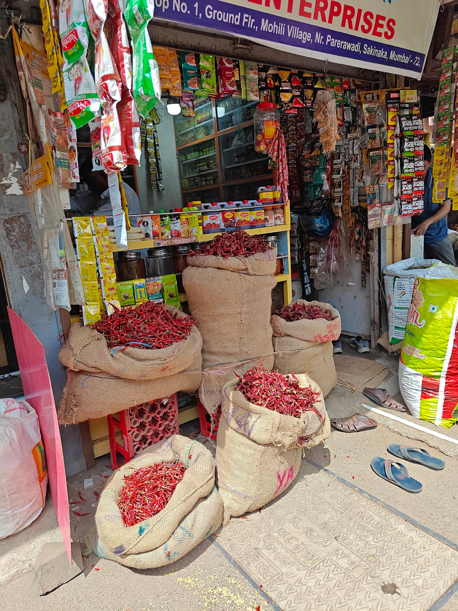 Here is a detailed description of the image: **Scene:** An outdoor storefront, likely a small grocery or spice shop, filled with sacks of dried red chilies. **Location:** The shop's banner indicates…read more