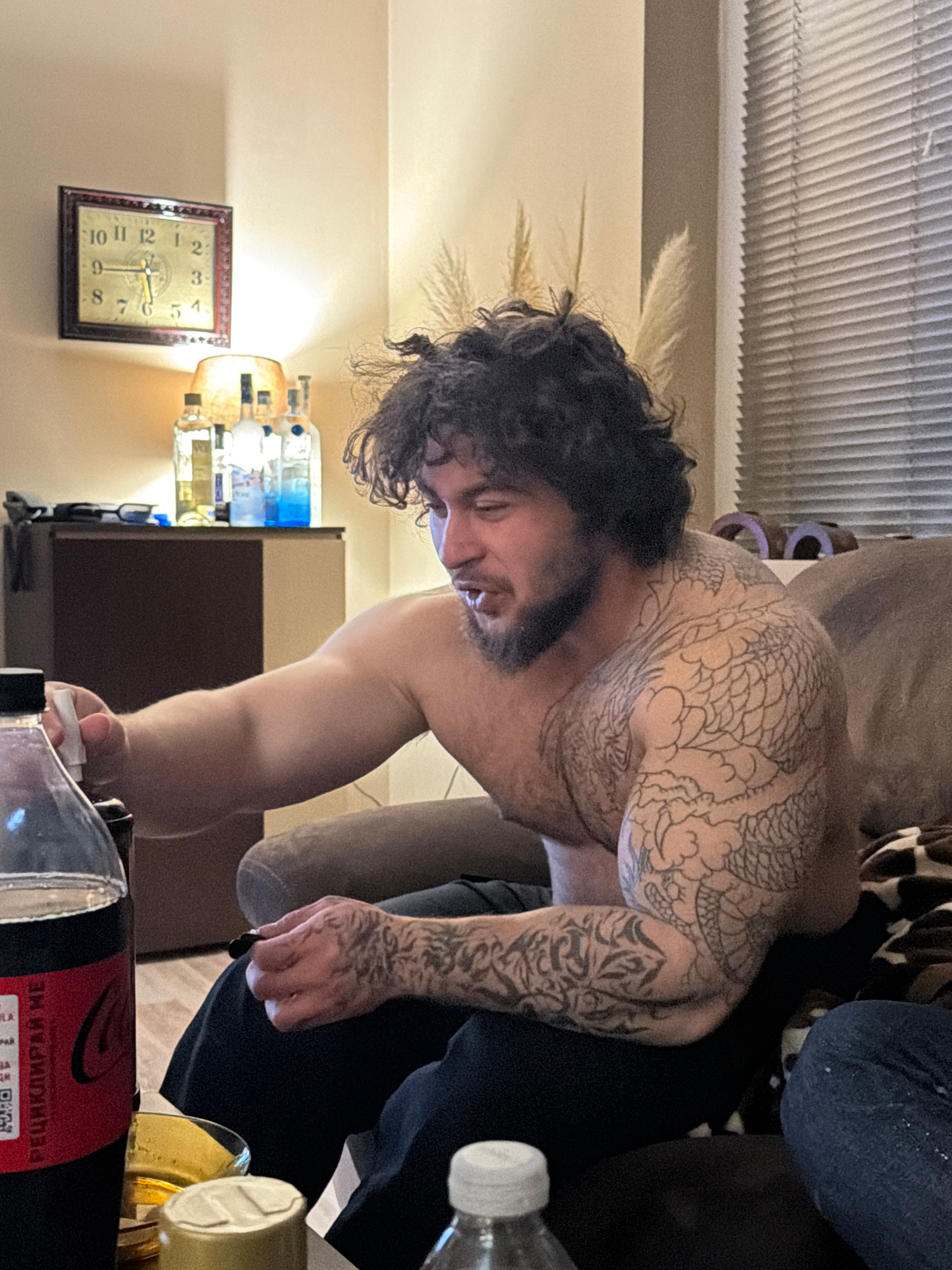 A man with dark, curly hair and tattoos on his arms and back is leaning over, holding a small white object, possibly a pill or a piece of paper. He appears to be looking down at something on a surface…read more