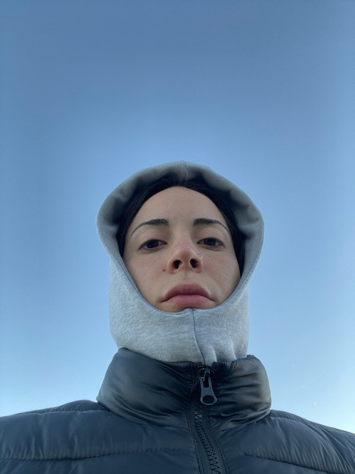 A low-angle, eye-level shot in Ushuaia, Argentina, shows one person from the chest up against a clear, solid blue sky. The individual, appearing to be female, looks directly into the camera with a neu…read more