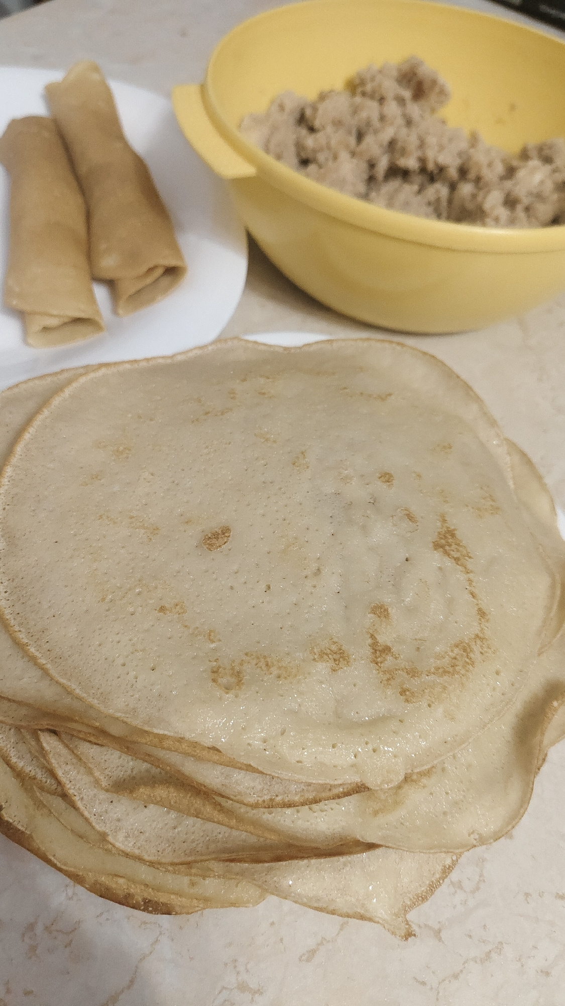 The image captures a close-up of a domestic food preparation scene, likely in a kitchen or dining area. The central focus is a stack of freshly made, thin pancakes, which appear to be blini or crepes,…read more