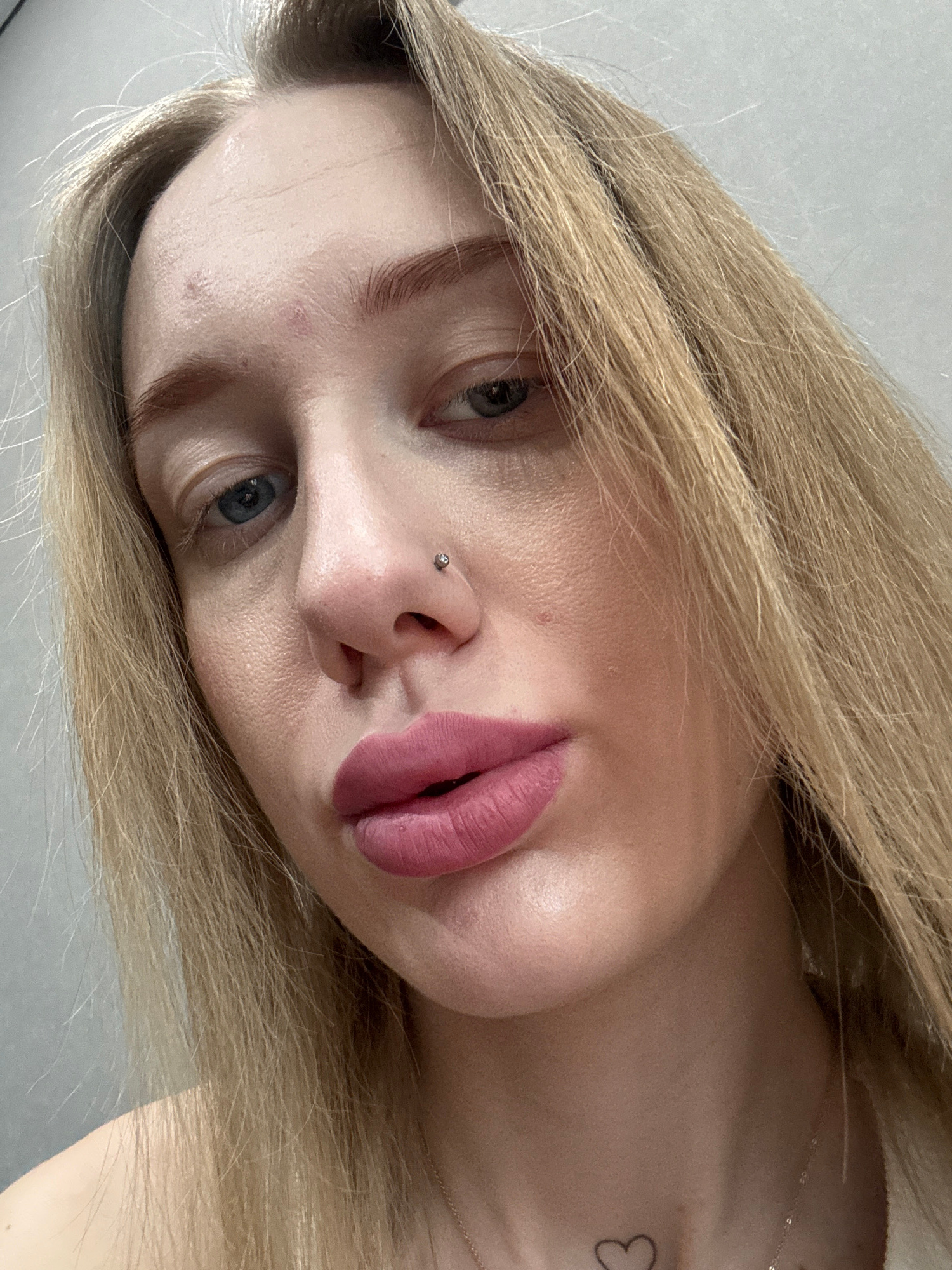 A close-up, rotated, portrait of a young woman with fair skin and blonde hair. She has blue eyes and a nose piercing. Her lips are colored pink. A small heart-shaped tattoo is visible on her upper cheβ¦read more
