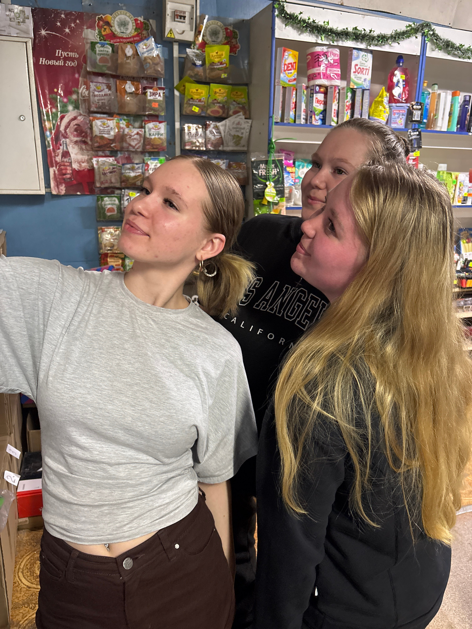 Three young women are browsing the shelves in a small store. Two of the women are fair-skinned, with long blonde hair; one wears a black shirt with “LOS ANGELES CALIFORNIA” printed on the front. The t…read more