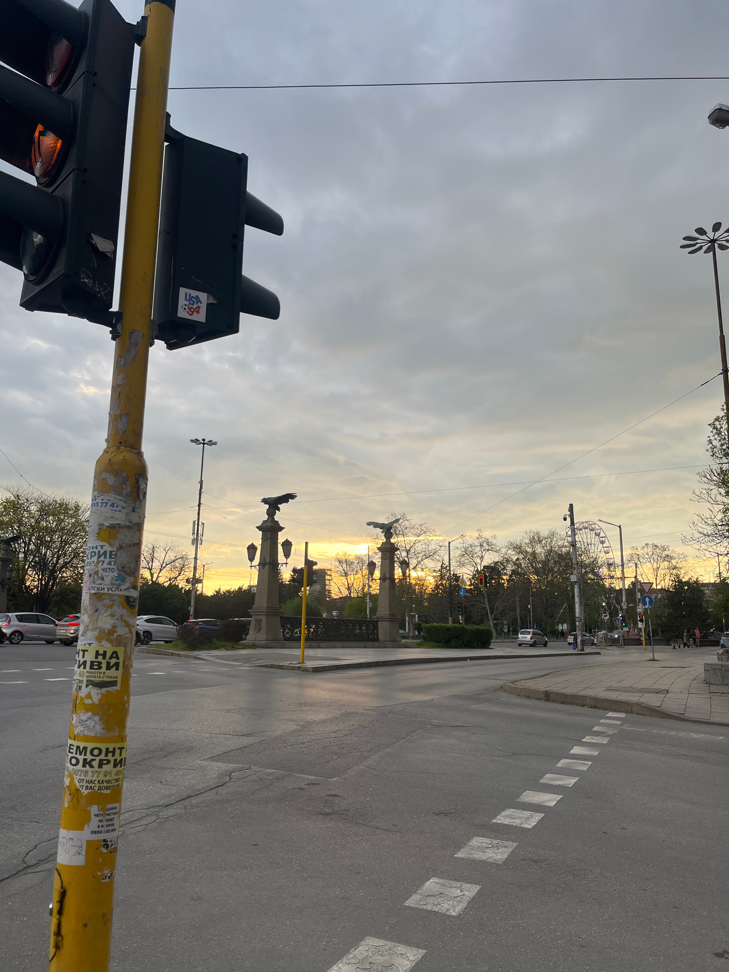 The image captures an urban street scene in Sofia, Bulgaria, oriented vertically (requiring a 90-degree clockwise rotation for proper viewing). The time of day appears to be either sunset or sunrise,…read more