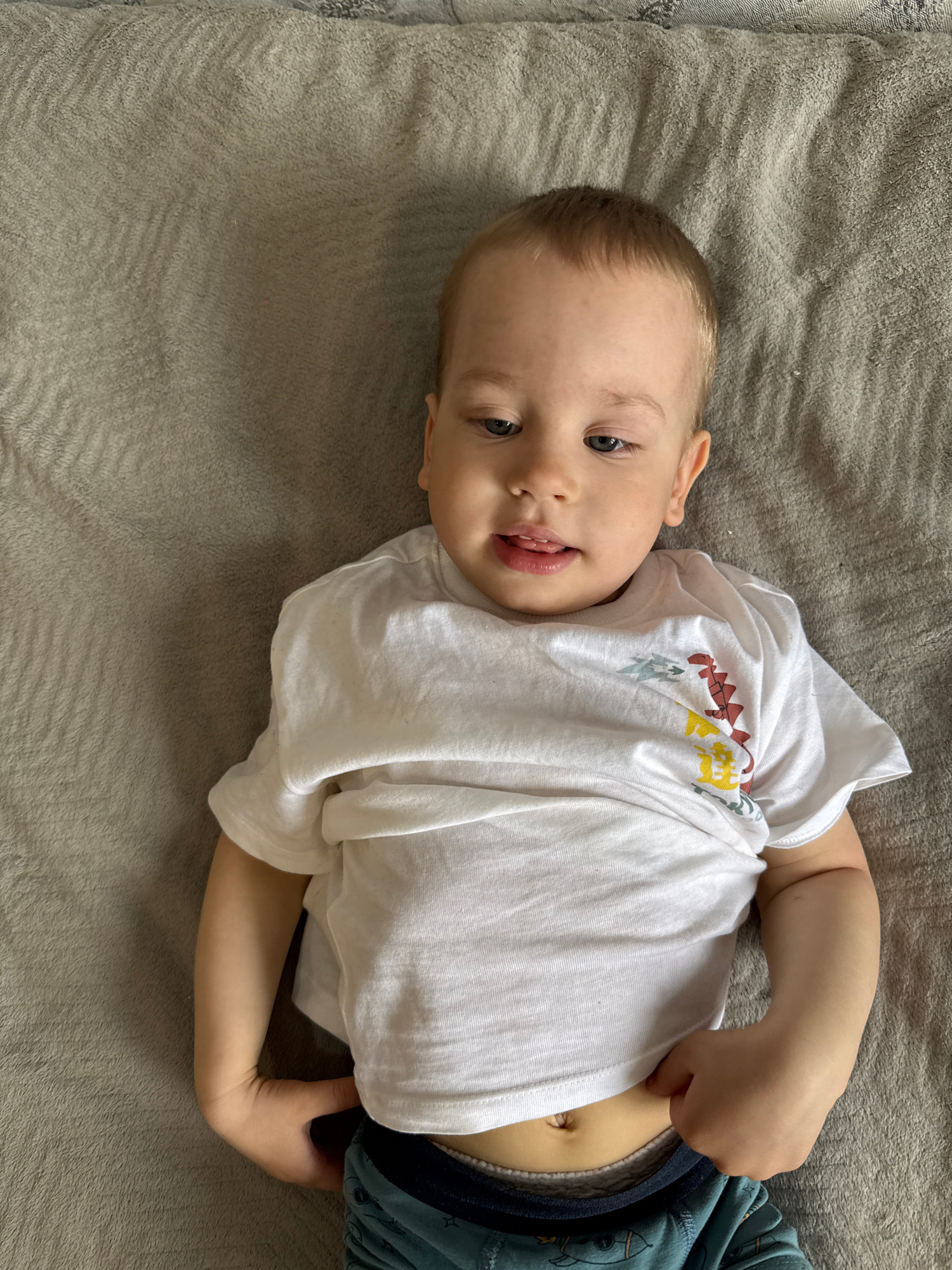 A young child lies on a gray blanket or surface, positioned on their back. The child is wearing a white t-shirt with a colorful design on the chest and light blue patterned pants. Their shirt is pulleβ¦read more