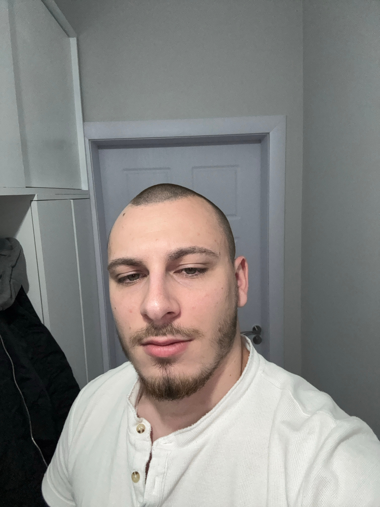 A man with closely cropped hair, light skin, and a beard is shown indoors. He is wearing a white waffle-knit shirt with two visible buttons. The background includes a white door with a silver knob, a…read more
