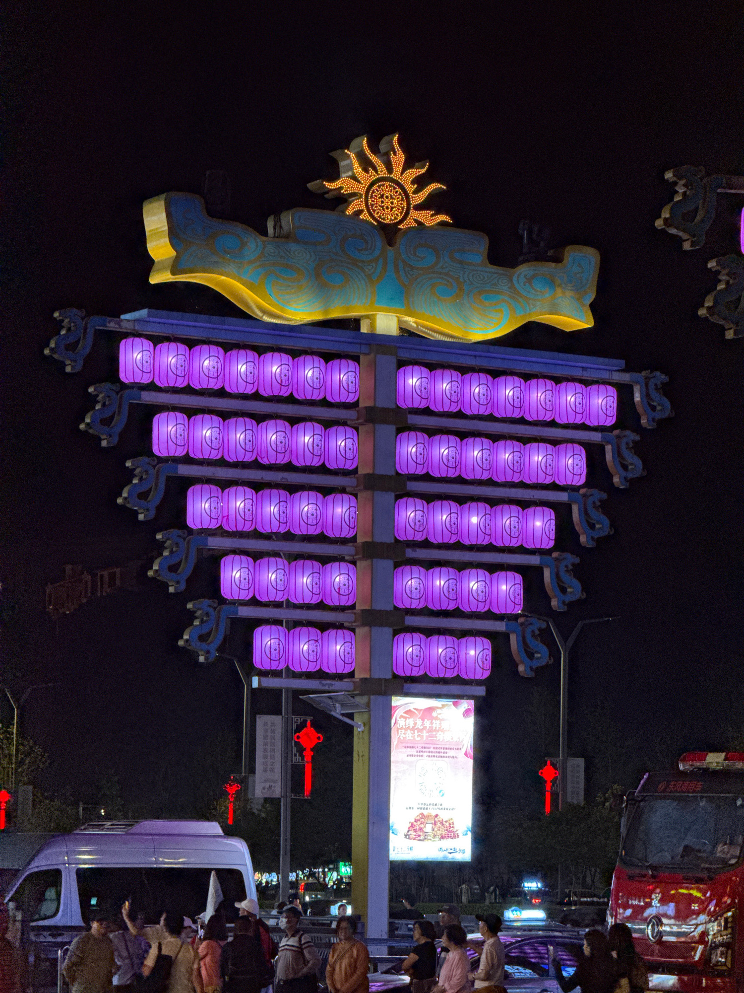 The image shows an outdoor night scene in Zhangjiajie, China. The main focus is a large decorative structure featuring a tall, stylized figure with blue and gold patterns, next to a sun-shaped light f…read more
