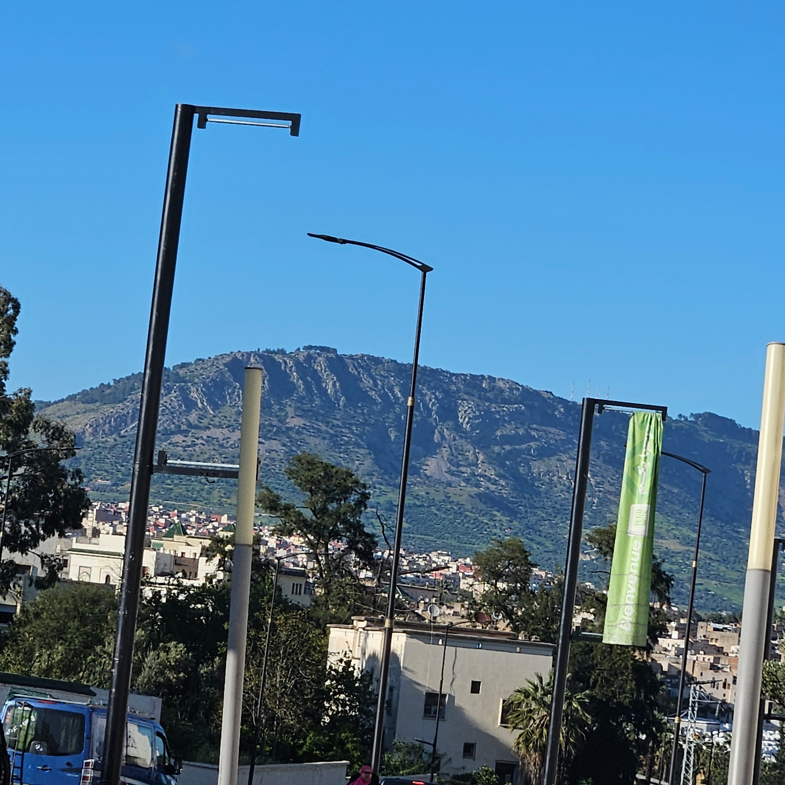 The image depicts a view in Fez, Morocco, characterized by a blend of urban and natural elements. The foreground includes a black metal streetlight against a clear blue sky. A green banner with whiteβ¦read more