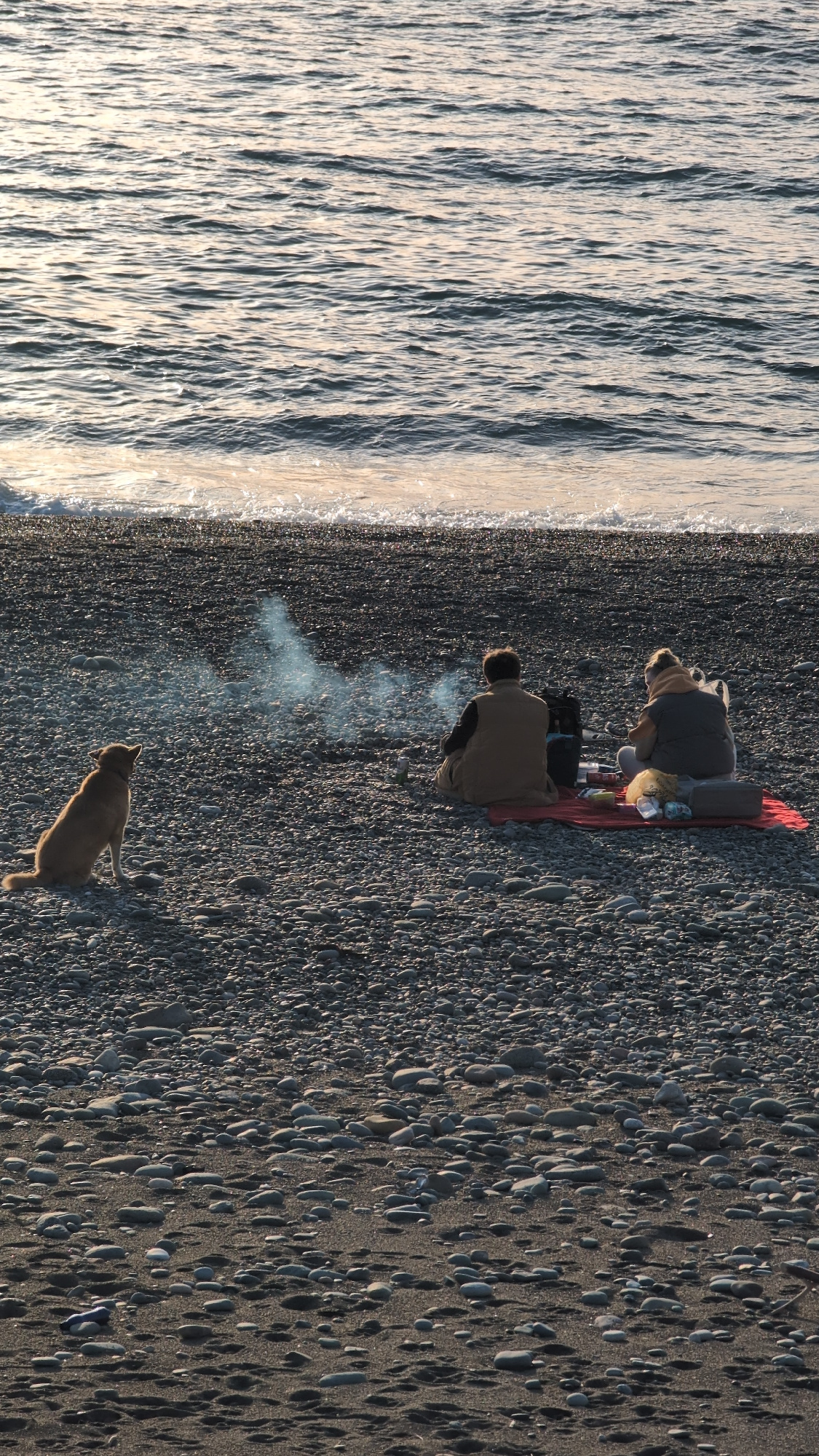 The image depicts a pebble beach in Kobuleti, Georgia. Two individuals are seated on a red blanket near a small fire emitting smoke. A dog is standing nearby, facing the sea. The sea occupies the left…read more