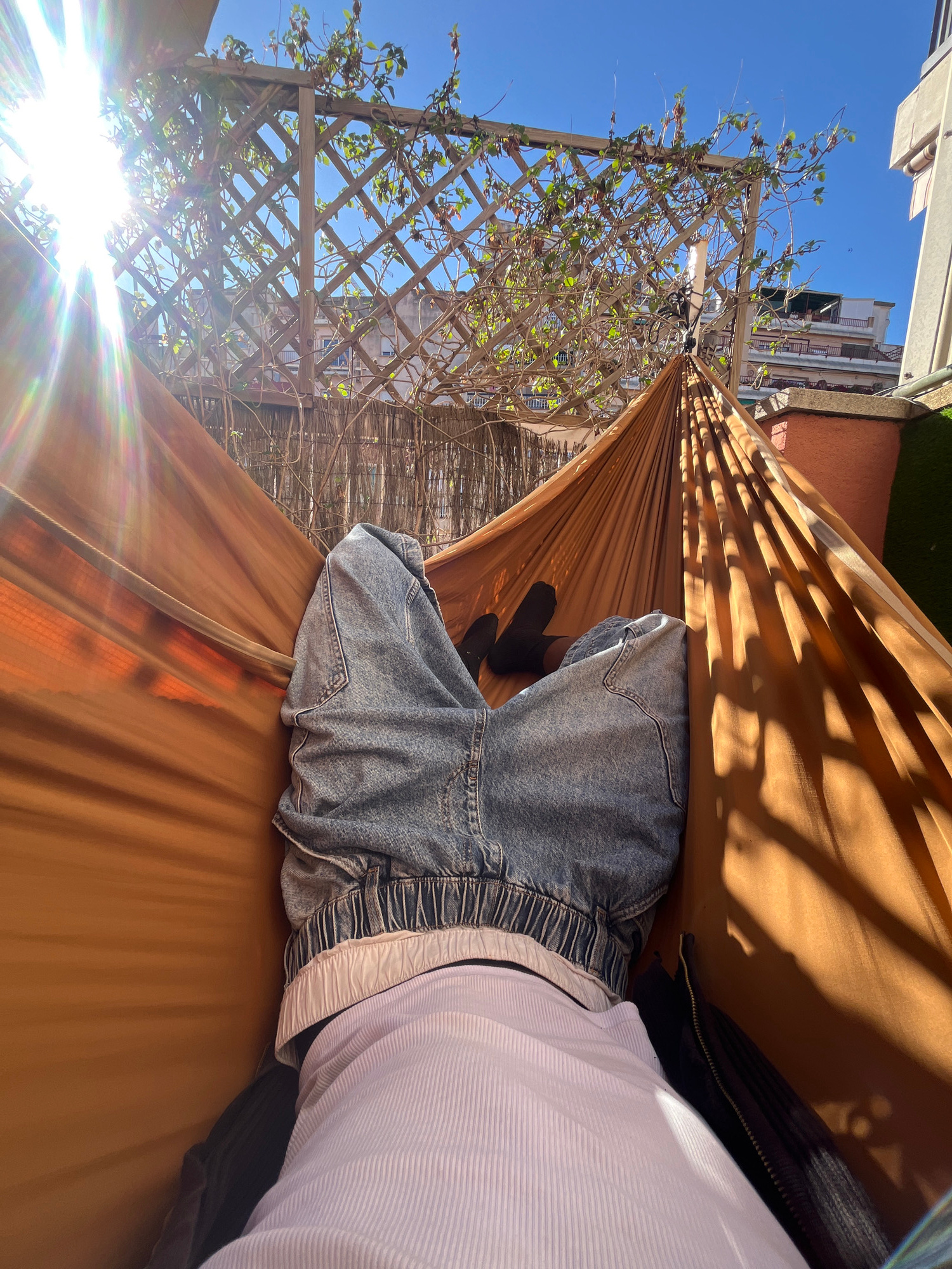 A person is lying in a hammock under a patio awning, wearing blue jeans, black socks, a dark jacket, and a striped white shirt. The hammock is suspended near a lattice fence with climbing vines. The l…read more