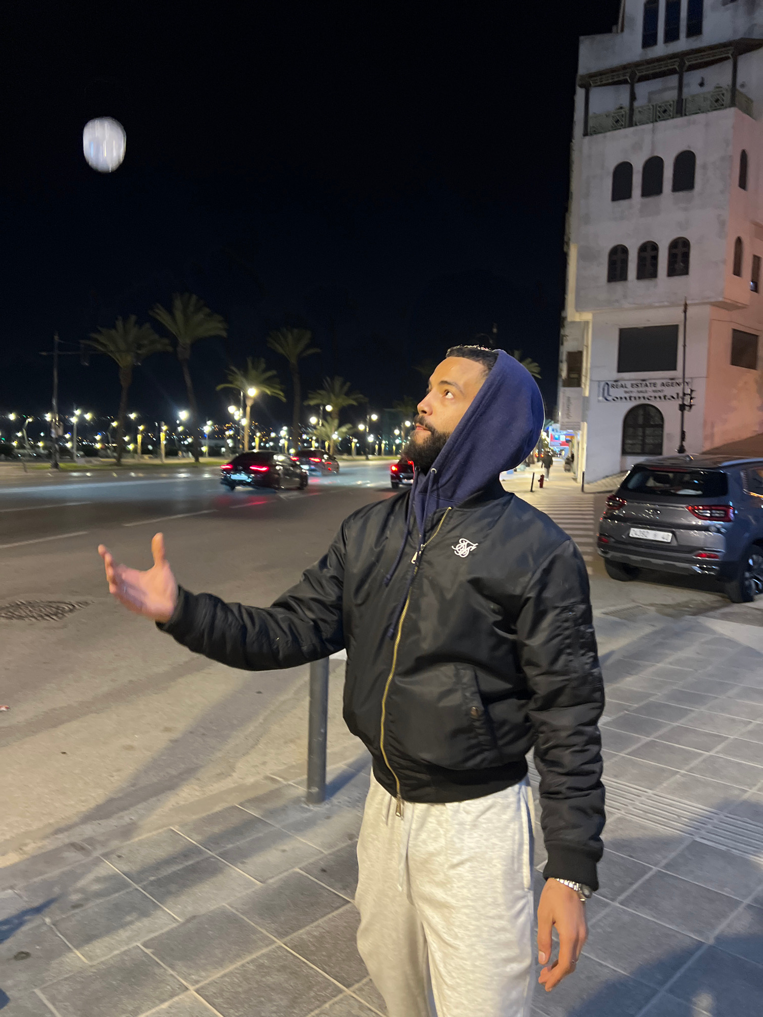 A nighttime scene depicts a male individual on a paved sidewalk alongside a multi-lane road in Tanger, Morocco. The man, with a beard and short dark hair, is positioned in the mid-ground, facing left…read more