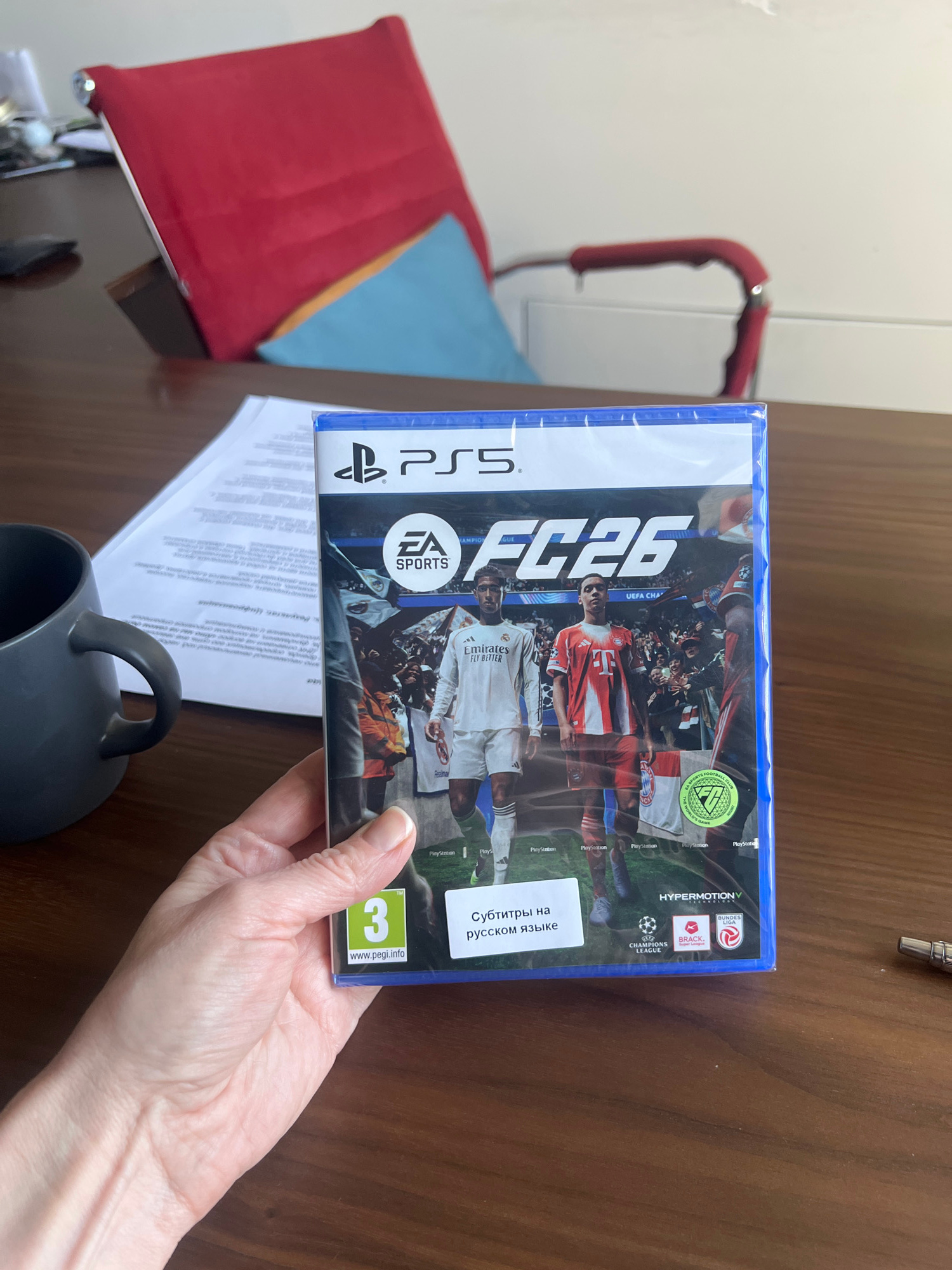 A person is holding a video game in their hand. The game is "FC26" for PlayStation 5. The box has a blue frame. The game is titled "Субтитры на русском языке", meaning "Subtitles in Russian". The PEGI…read more