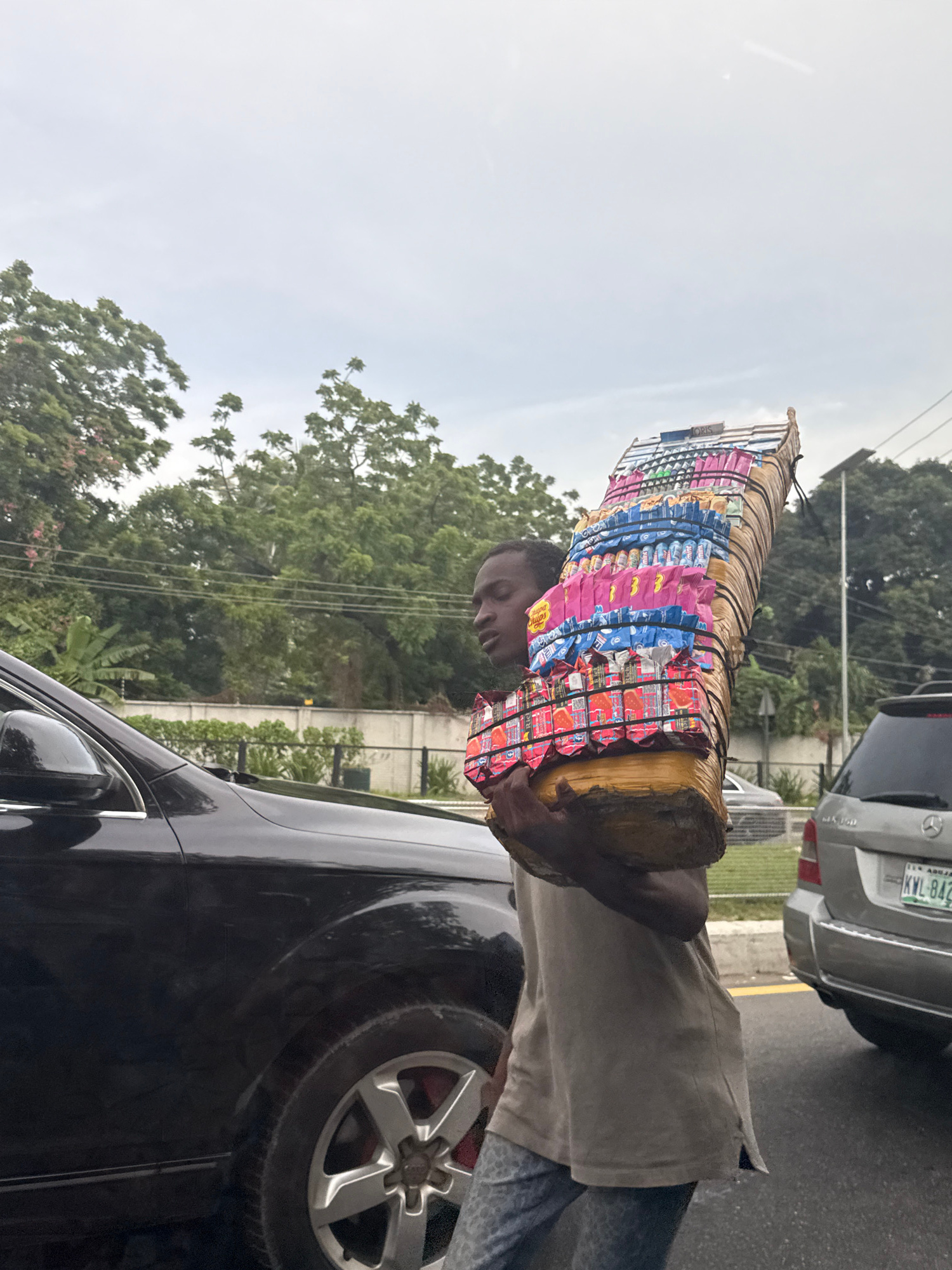 A street vendor carries a large rack of snack foods on his head in Falomo, Nigeria. The vendor is walking near slow-moving traffic, including a black car and a silver SUV. The background includes tree…read more