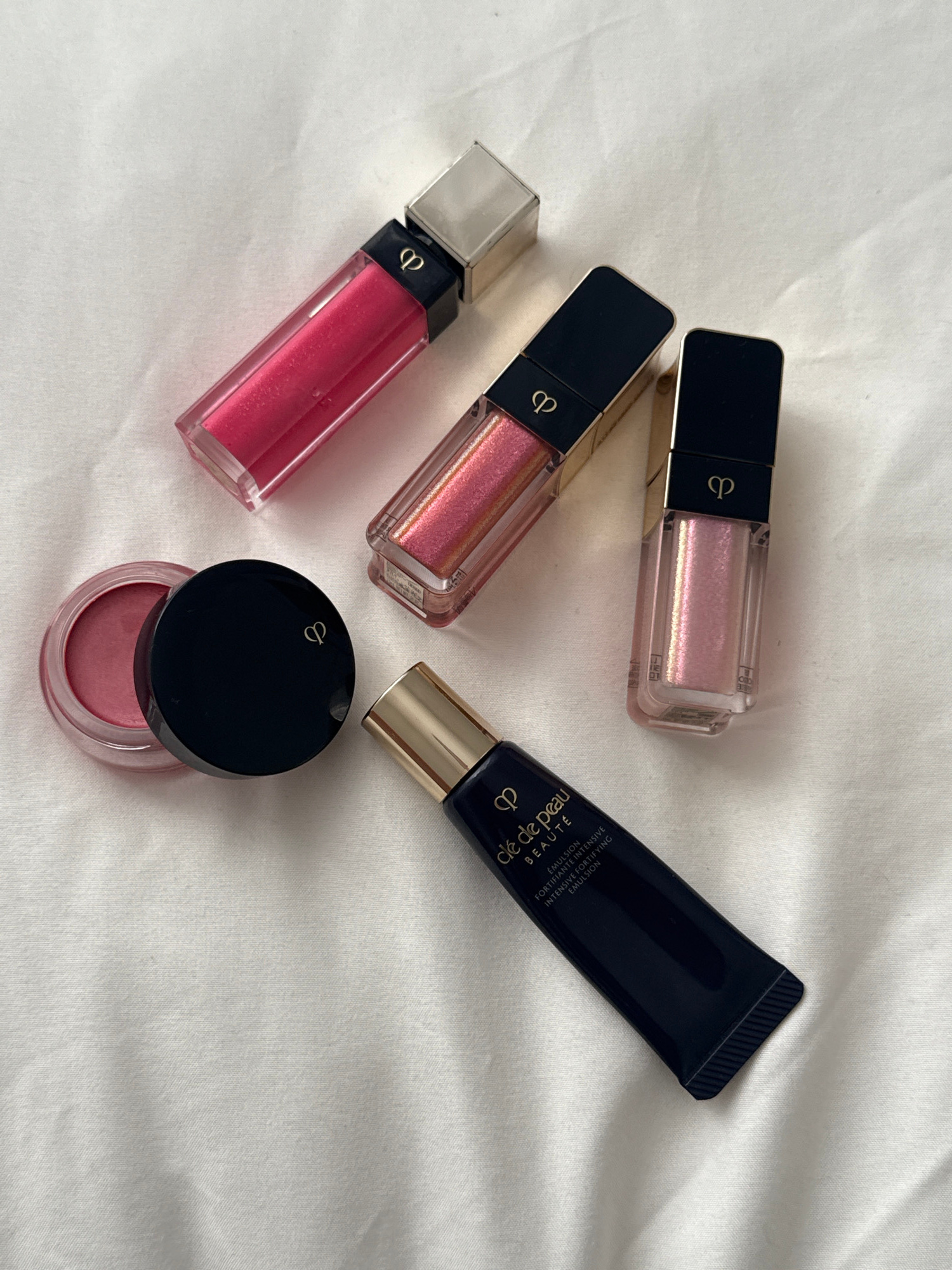 The image shows a still life arrangement of Clé de Peau Beauté makeup products on a white, textured surface, likely a bedsheet or other cloth. The items include three lip glosses in clear, rectangular…read more