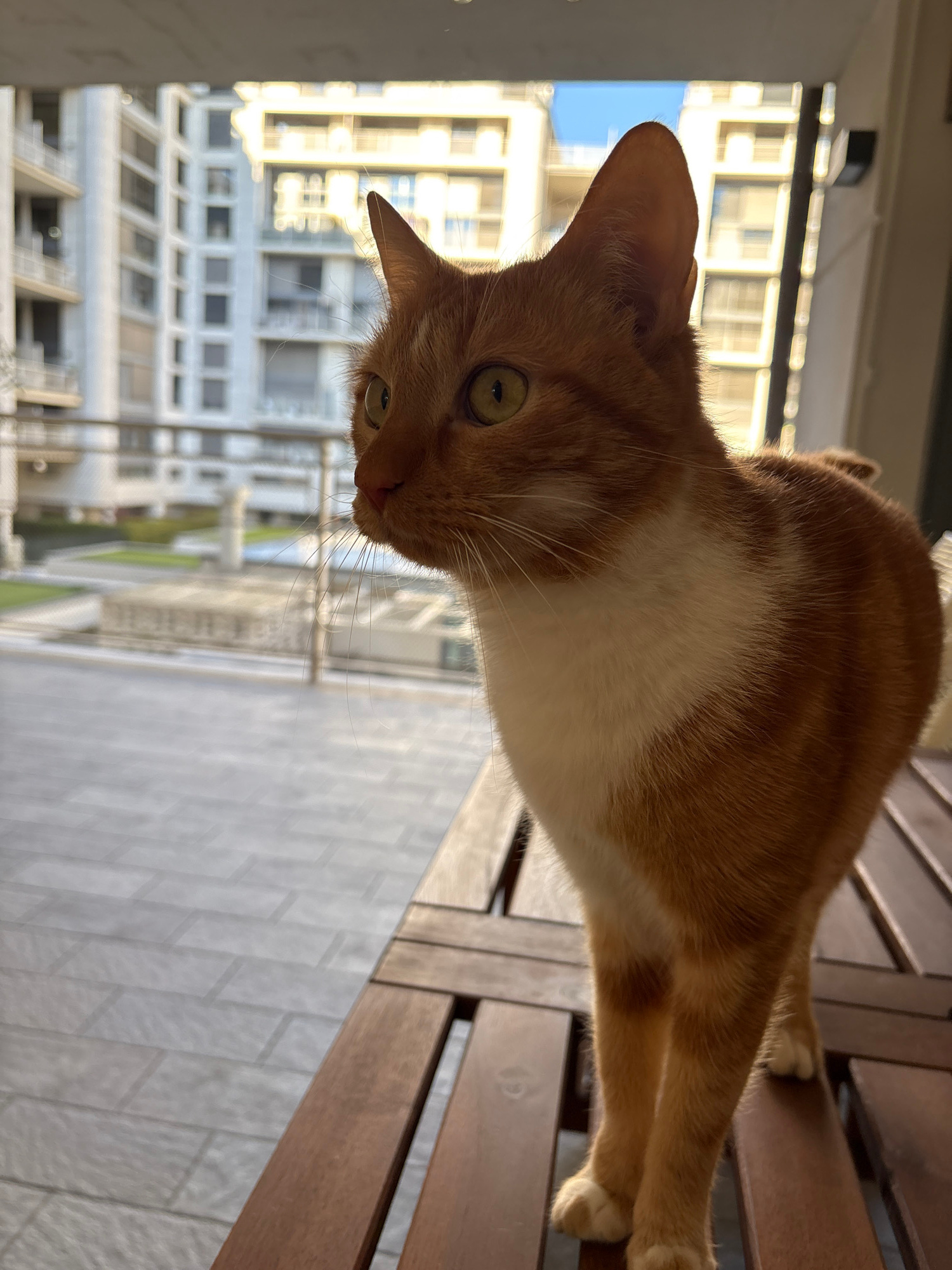 A medium-sized, short-haired, ginger and white cat is perched on a brown, slatted wooden surface, possibly a table or outdoor furniture. The cat is oriented at an angle, facing downwards with its head…read more