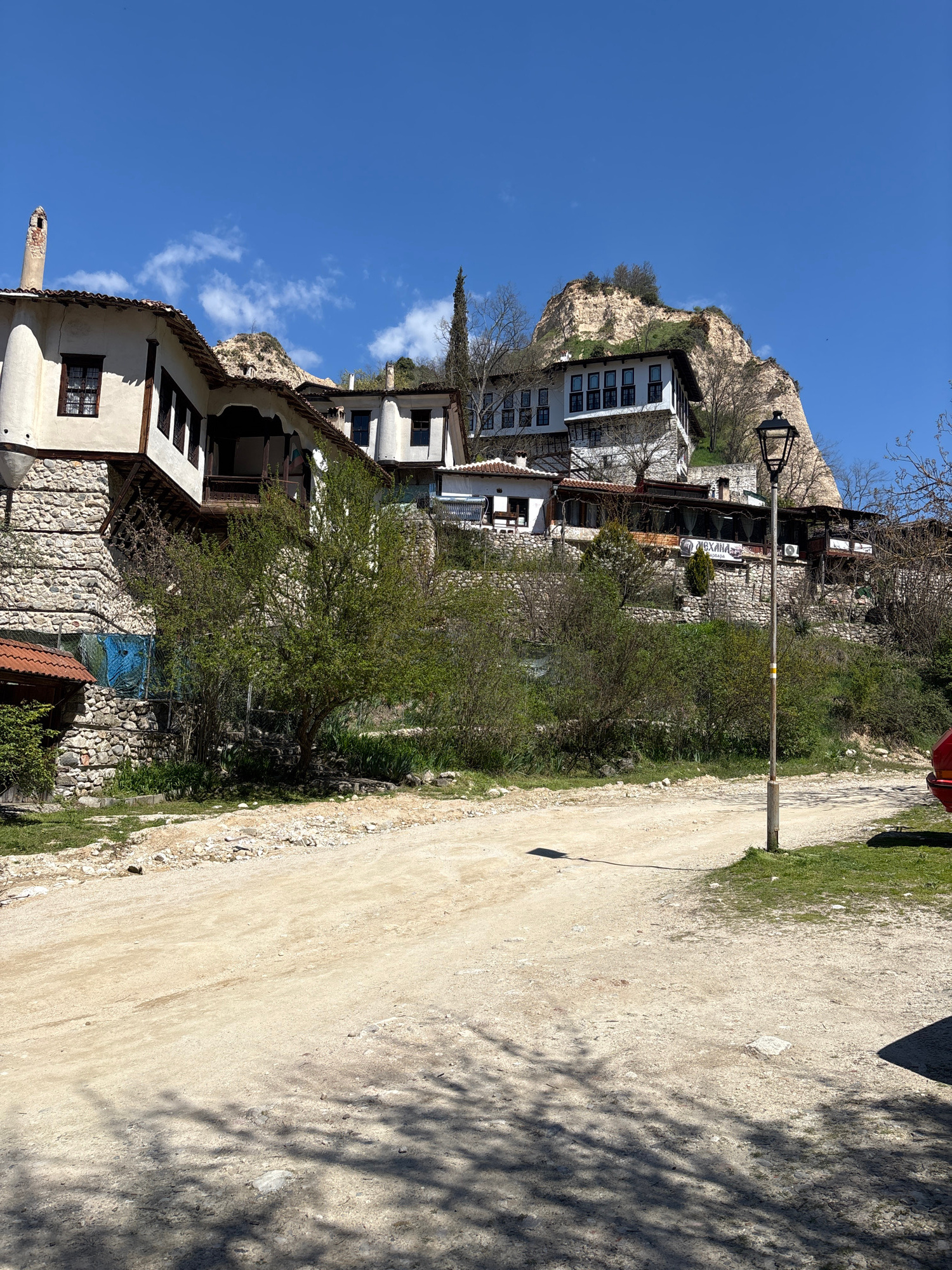 The image depicts a street scene in Melnik, Bulgaria, with a dirt road running along the right side of the frame. The shadows of trees are cast on the road surface. On the left side, traditional Melniβ¦read more