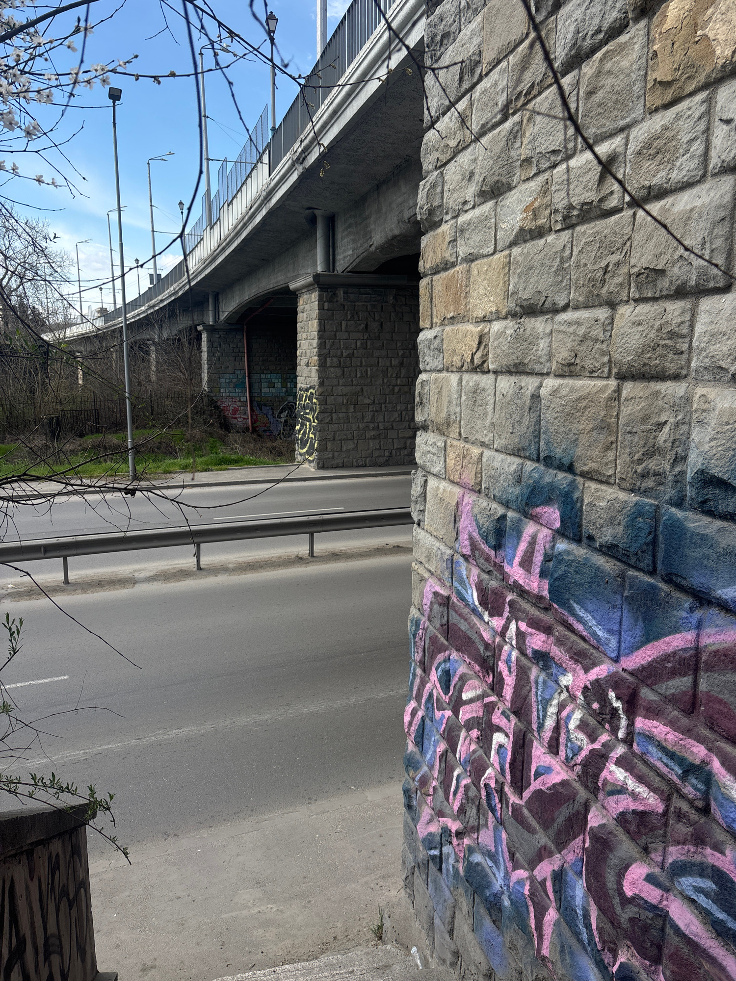 The image shows an elevated highway overpass in Varna, Bulgaria. The underside of the highway structure is composed of large stone blocks, some of which are covered in graffiti. A four-lane road passe…read more