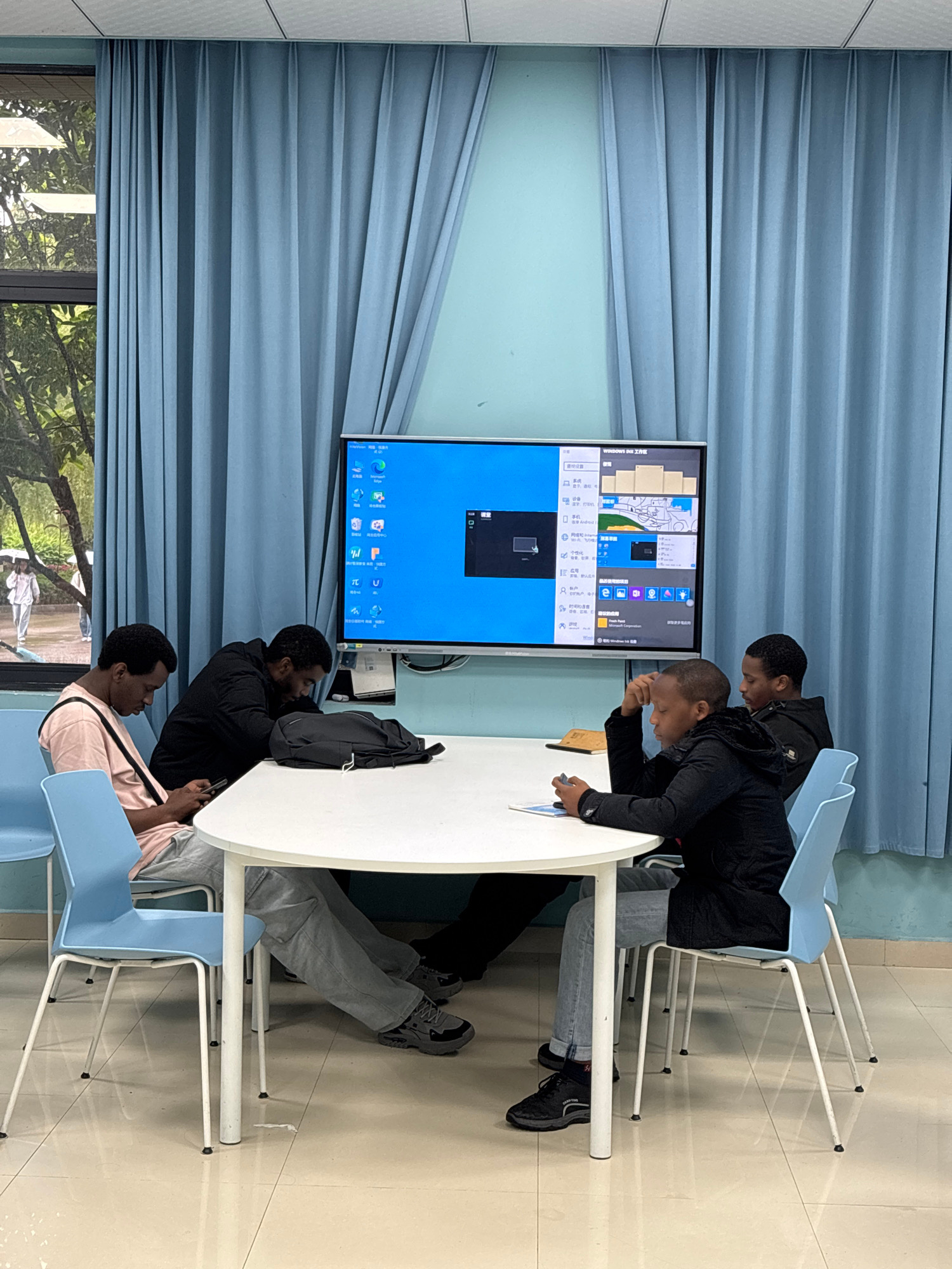 In a tiled room, four people are gathered around an oval, white table. They are examining a screen showing a computer desktop interface. The people are seated on light blue chairs with white legs. A w…read more