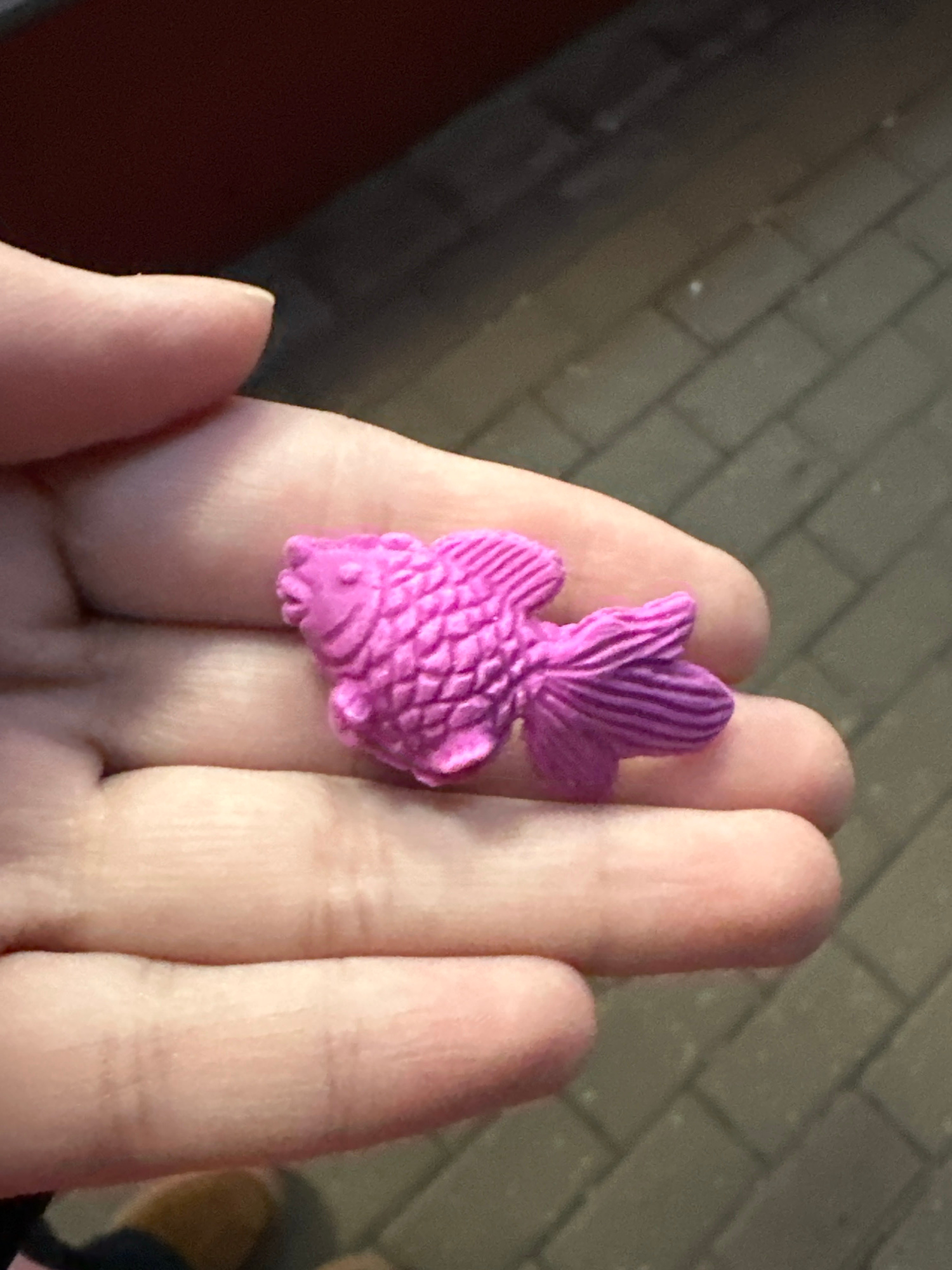 A pink, fish-shaped eraser rests on the palm of a hand. The background is blurred, but shows pavement suggestive of an urban area. The location cannot be determined from this image.