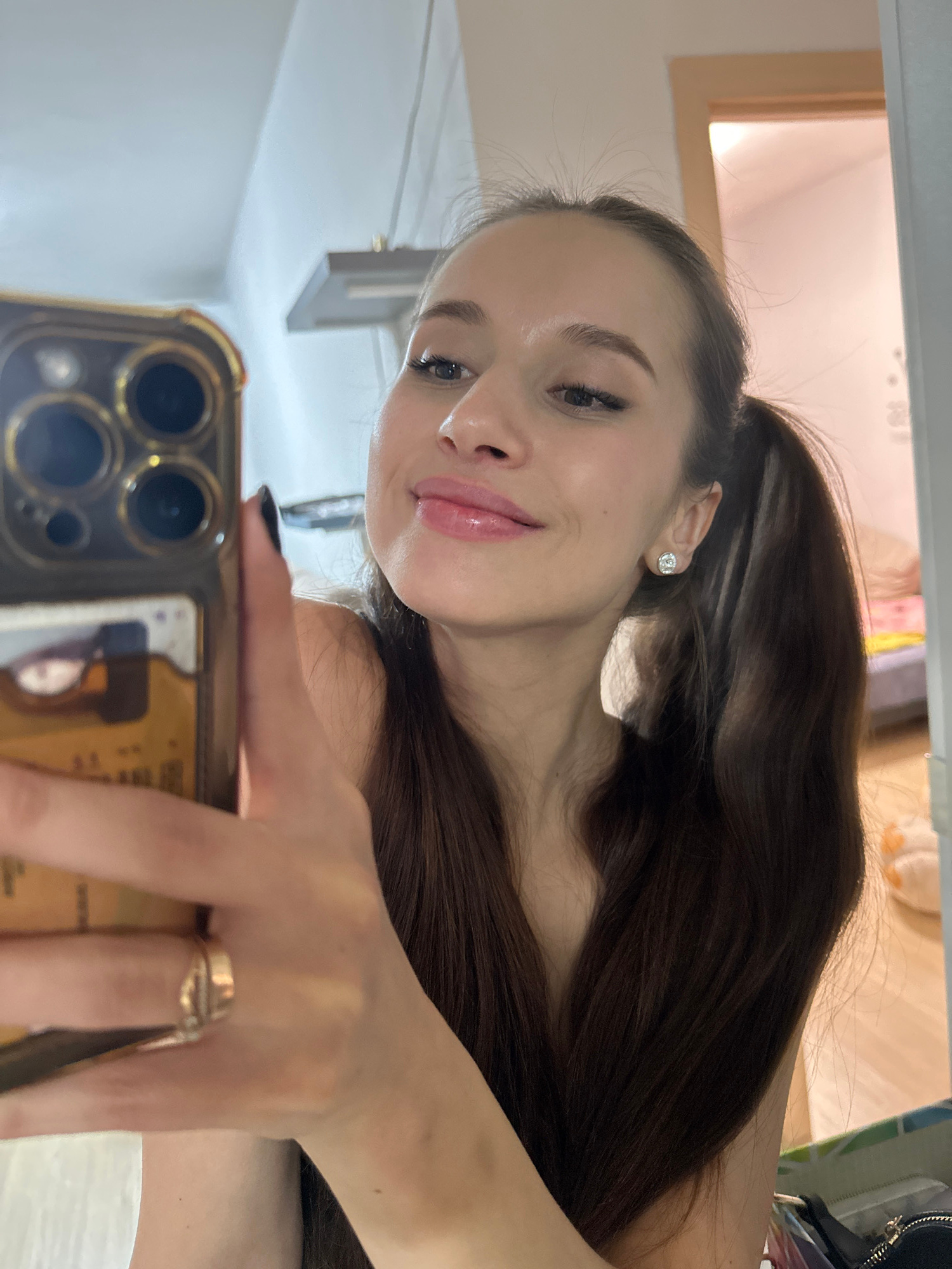 A woman with long, dark hair in a high ponytail is taking a selfie with a smartphone. She has fair skin, dark eyes, and full lips with a glossy sheen. She is wearing stud earrings. Her left hand is hoβ¦read more