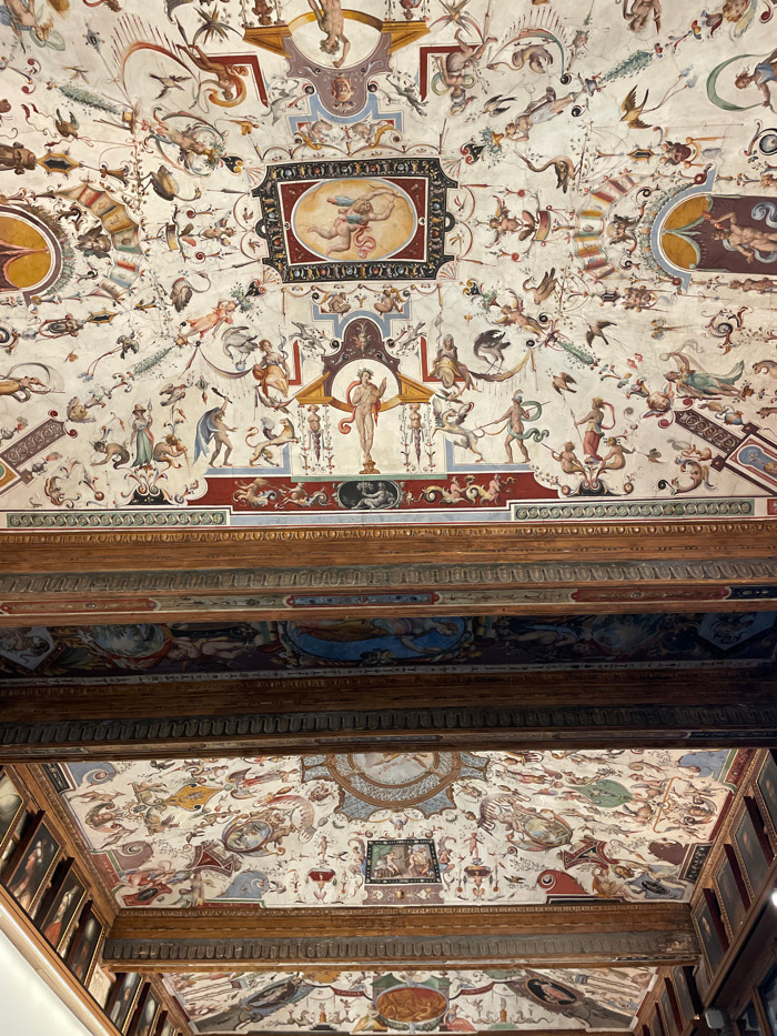 The image displays an upward view of an elaborately decorated ceiling within the Palazzo Vecchio in Florence, Italy. The primary visual is a vast frescoed ceiling, rendered in the grotesque style, fea…read more