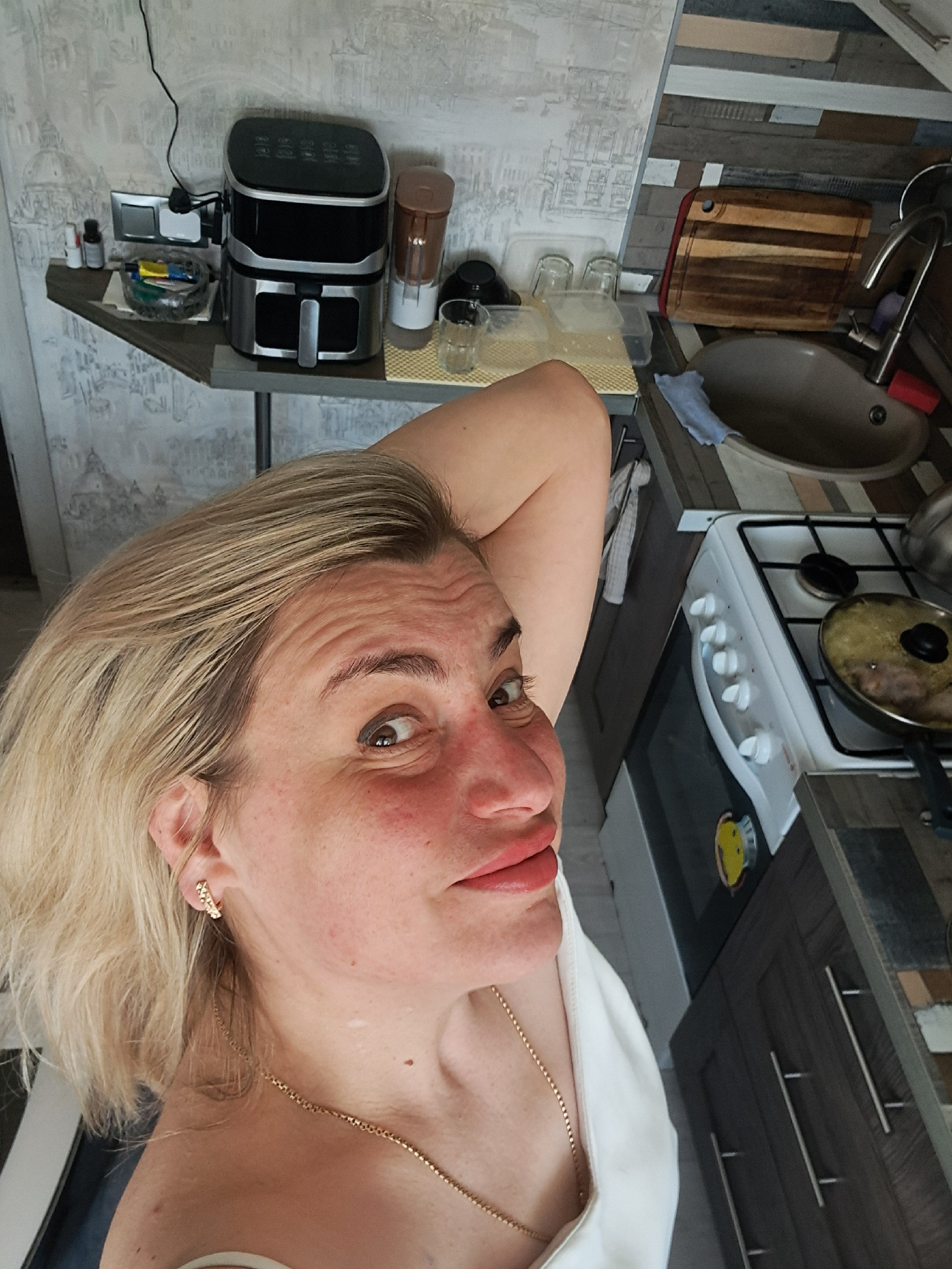 A woman with fair skin and blonde hair is positioned in the foreground, appearing to be indoors. She is wearing a gold necklace and has a white garment draped over her shoulder. Her face is angled towβ¦read more