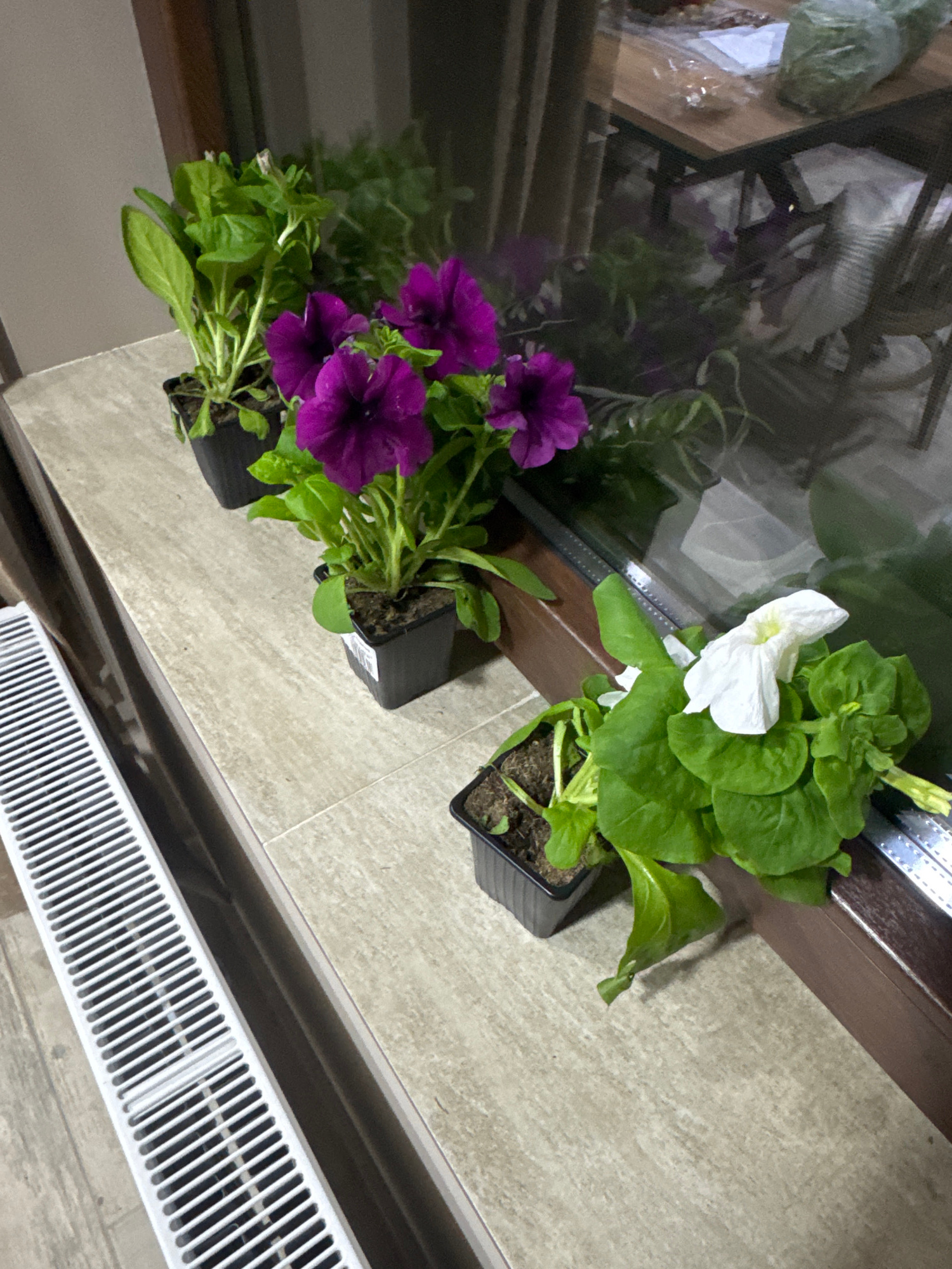 A high-angle, eye-level shot depicts three potted plants, two with purple flowers and one with white, arranged on a light beige tile surface. The plants are in dark-colored plastic pots, positioned ne…read more