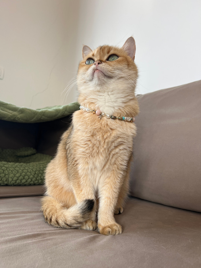 A golden-furred domestic cat is seated upright on a light brown upholstered couch in an indoor residential setting, identified as Bjeliši, Montenegro. The cat possesses green eyes and wears a multi-be…read more