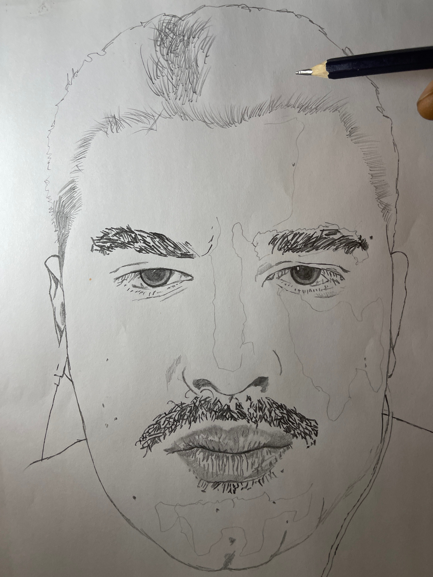 The image displays a close-up, top-down perspective of a partially completed pencil sketch of a human head on white paper, located in Jos, Nigeria. The central subject is a front-facing portrait, rendβ¦read more