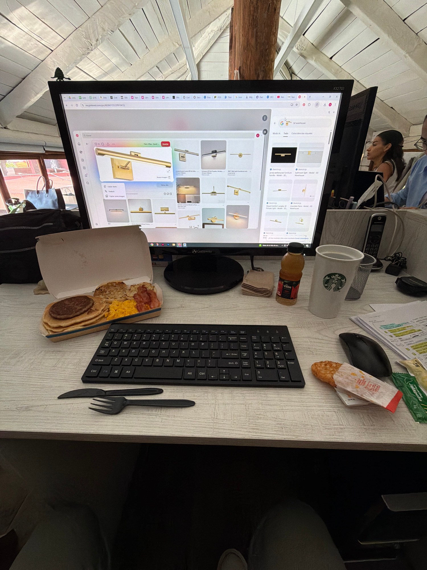 Here's a detailed description of the image: **Scene Overview:** The image depicts a workspace, likely in an office setting. The scene is dominated by a desktop covered with various items, including a…read more