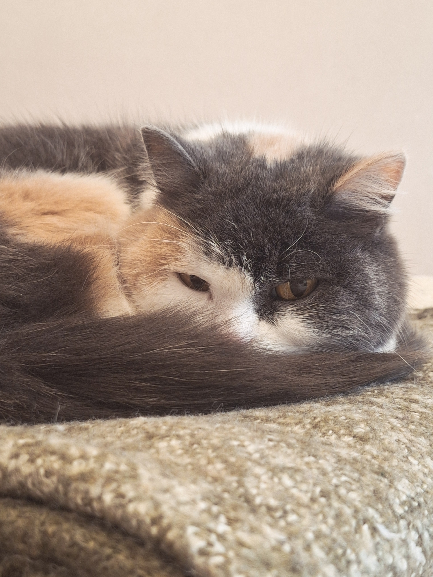 A cat is partially obscured by a rough, tan-colored, possibly carpeted object. The cat is gray, white, and tan, with its head and paws visible. The cat appears to be looking down. The setting appearsβ¦read more