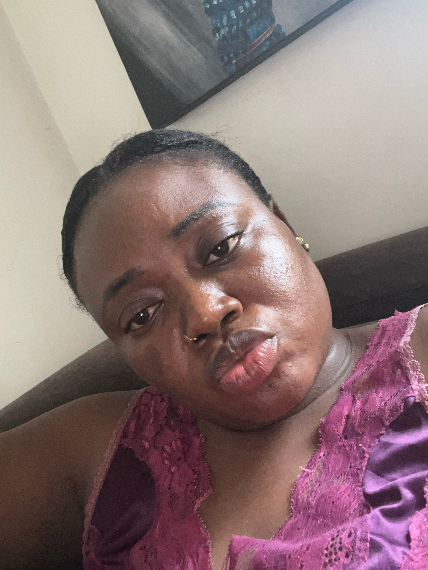 A close-up, rotated selfie shows a dark-skinned person with a nose ring, wearing a maroon lace-trimmed top. The background includes a light-colored wall and a dark, indistinct object in the upper left…read more